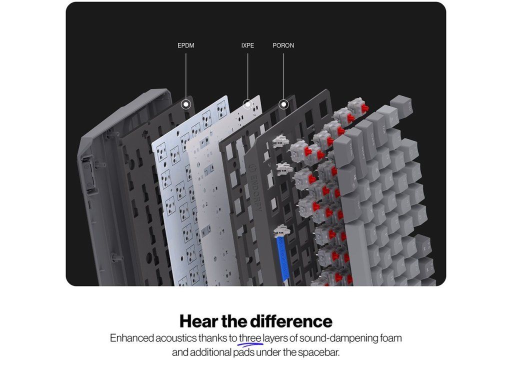 Klávesnice je vyrobena z prémiových materiálů a vyztužena pevnou hliníkovou horní deskou, díky čemuž nabízí robustní a vyvážený pocit při používání. Tři vrstvy akustické pěny PORON, EPDM a IXPE minimalizují ozvěnu a eliminují dutý zvuk při psaní pro čistý a uspokojivý akustický zážitek.