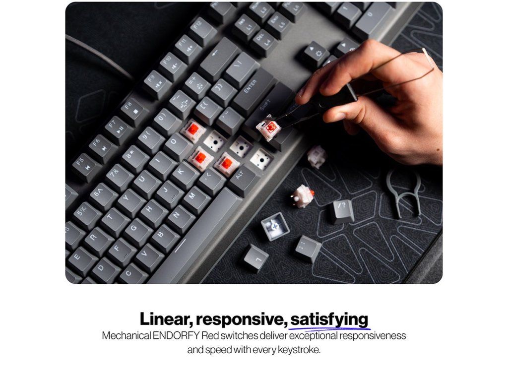 - Exkluzivní lineární mechanické spínače Endorfy Red s továrním předlubrikováním