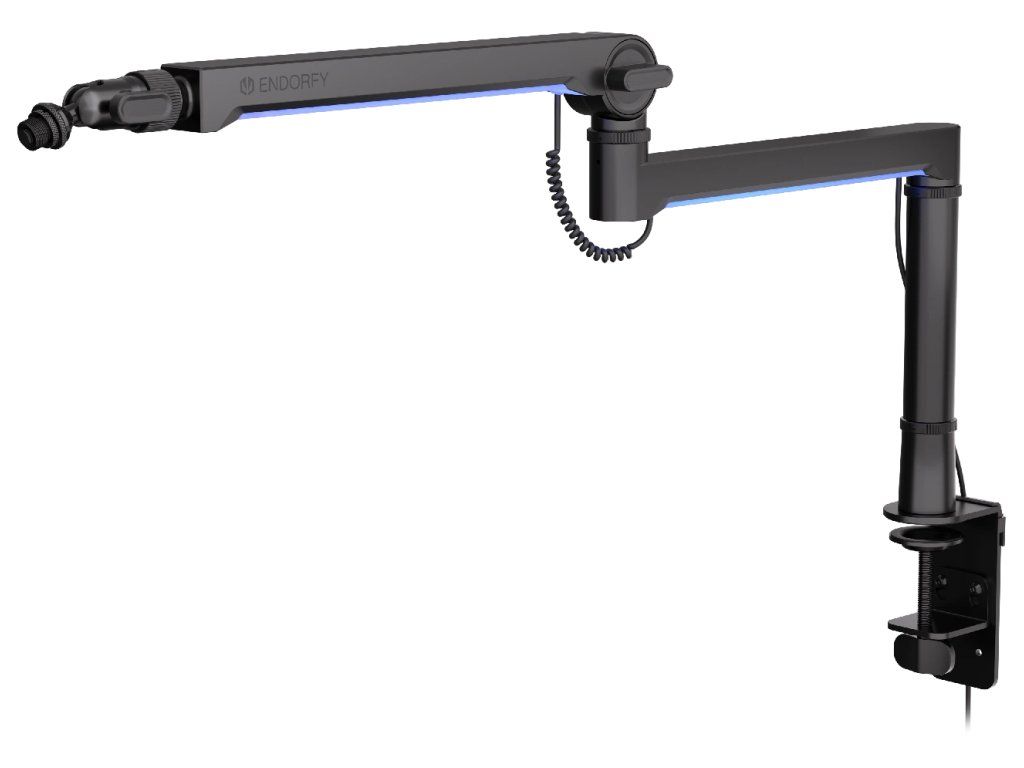 Endorfy Broadcast Low Profile RGB Boom ArmNastavitelné rameno s vícebarevným podsvícením a 3 klouby pro ideální polohu mikrofonu při streamování nabízí jednoduchou a pevnou montáž pomocí šroubu ke stolní desce o tloušťce 15 až 105 mm. Stojan je vhodný pro všechny běžně používané mikrofony do hmotnosti až 2 kg. Díky kulové hlavě s 360° rotací a nastavitelným prodlužovacím segmentům (82 mm a 157 mm) můžete mikrofon umístit přesně podle svých potřeb. Předností jsou také vestavěné konektory USB a USB-C, systém pro skryté vedení kabelů či podpora 5/8", 3/8" i 1/4" závitů.