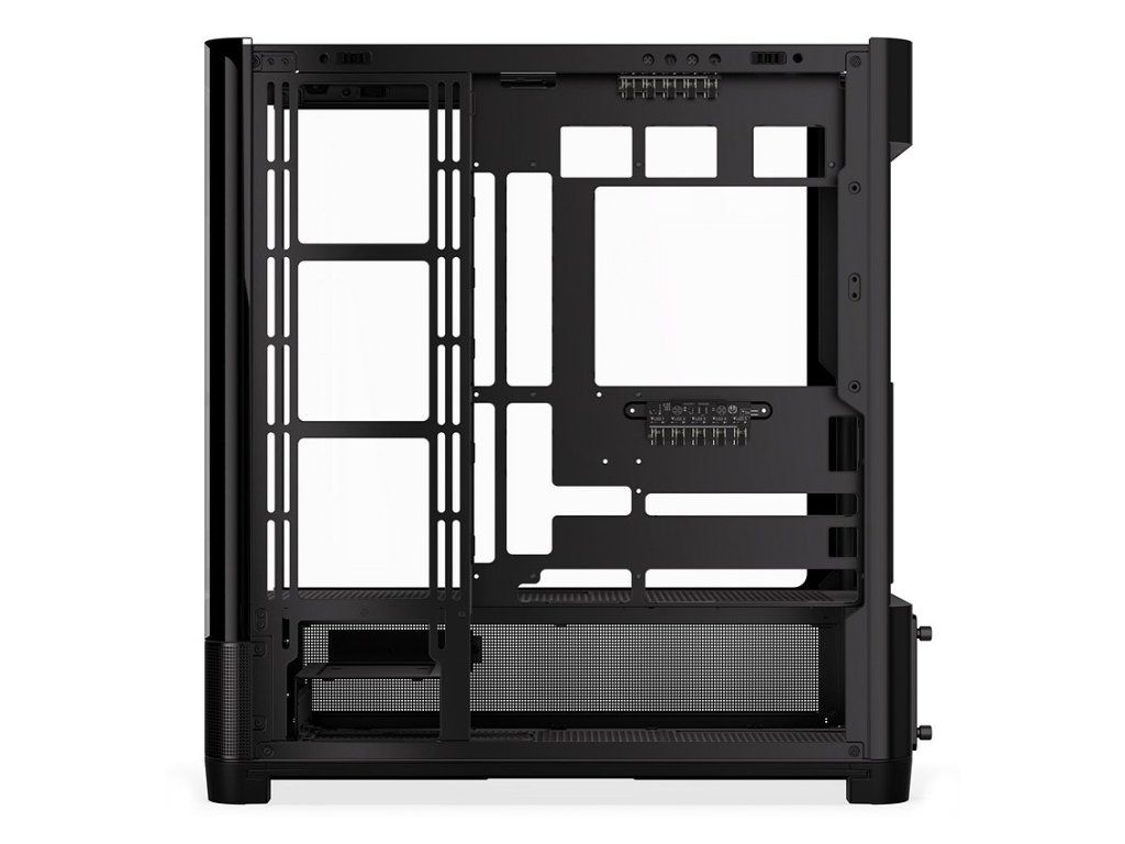 Velký prostor za trayem základní desky a množství úchytů pro stahovací pásky (včetně vnější zadní strany) usnadňují vedení kabelů a umožňují vytvořit čistou a přehlednou sestavu i u složitějších konfigurací. Oddělená komora pro zdroj v dolní části pomáhá udržet vnitřek přehledný a zároveň snižuje celkovou šířku skříně.