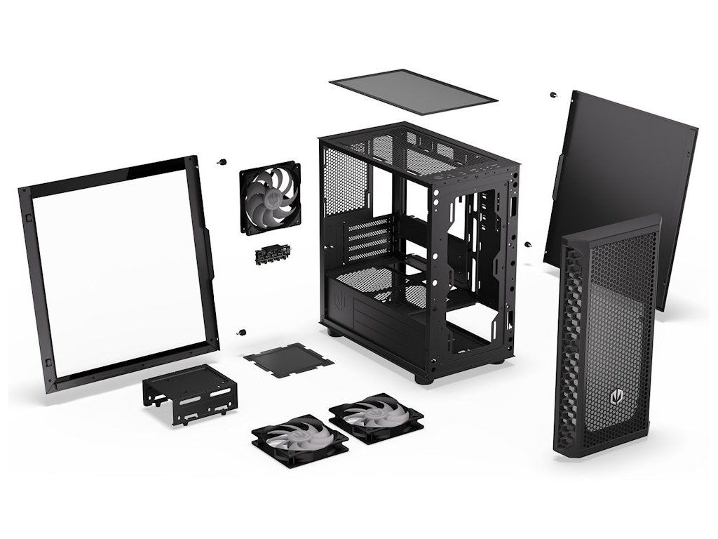 Moderní vzhled dotváří prosklená boční stěna z tvrzeného skla pro prezentaci sestavy a ARGB podsvícení s přiloženým kontrolérem. Skříň nabízí prostor pro grafické karty do délky 345 mm, CPU chladiče do výšky 159 mm a vodní chlazení s až 240mm radiátory. Magnetické prachové filtry a přední mesh panel lze snadno vyjmout a vyčistit.