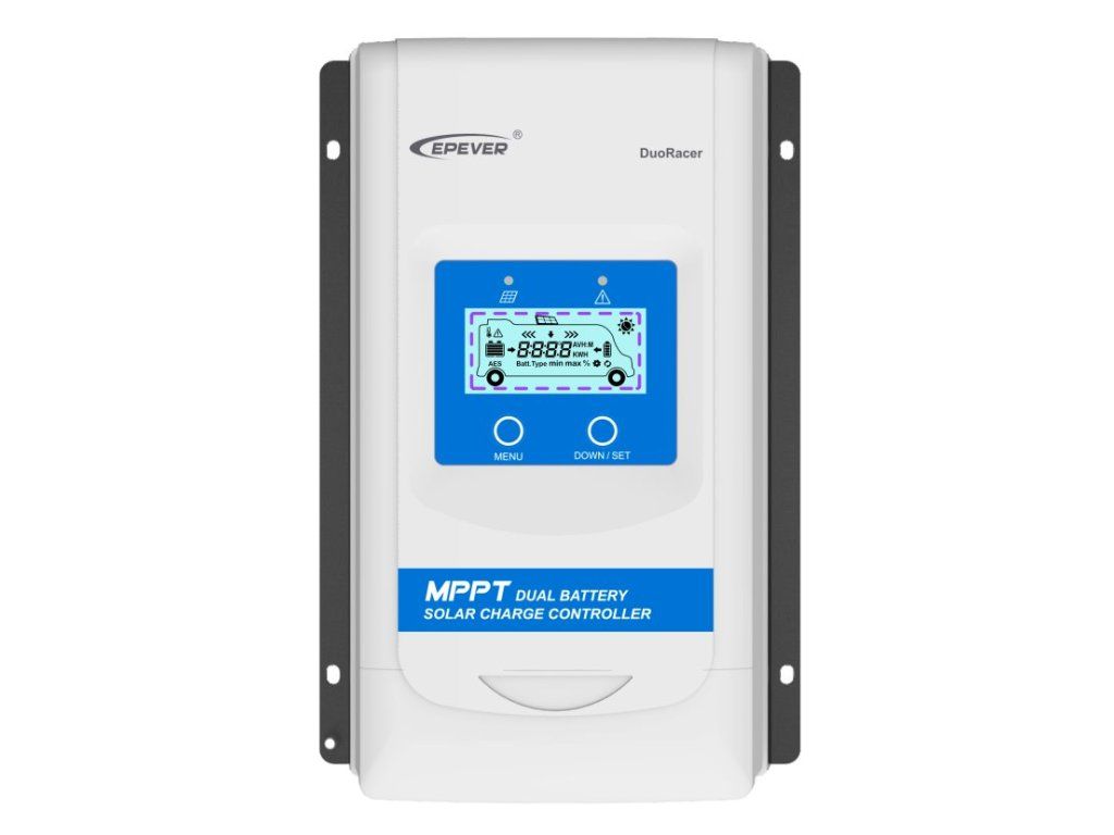 EPEVER DR1206-DDSMPPT regulátor série DuoRacer je určen k nabíjení dvou baterií vhodný pro karavany, lodě atd. Napětí panelů až 60 V a maximálním nabíjecím proudem 10 A, baterie 12/24 V, FV max. 130/260 Wp.