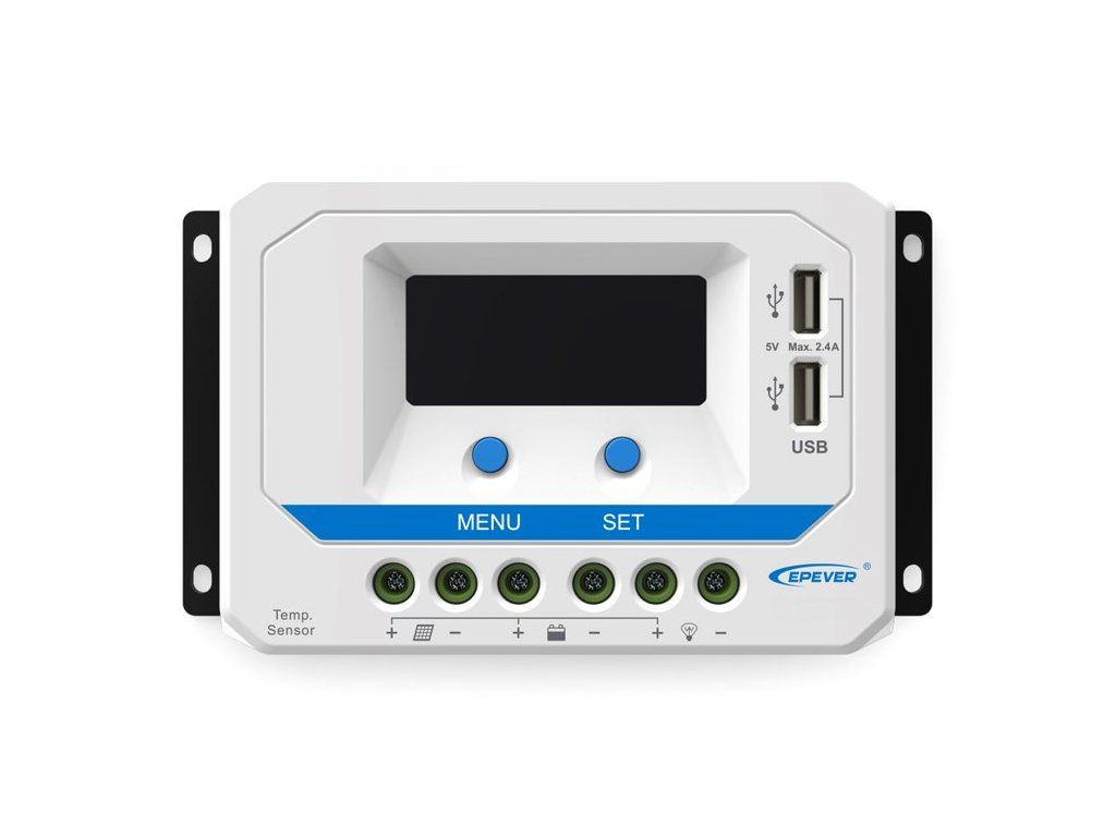 Vestavěný LCD přehledný displej Vám poskytne informace o napětí a proudu solárního panelu, napětí baterie a nabíjecím proudu a také o aktuálním odebíraném proudu pro DC spotřebiče. Také nabízí statistické informace o celkovém množství vyrobené a spotřebované energie. Pomocí tlačítek pod displejem můžete nastavit jeden ze tří typů olověných baterií (utěsněná, gelová nebo otevřená kapalinová).