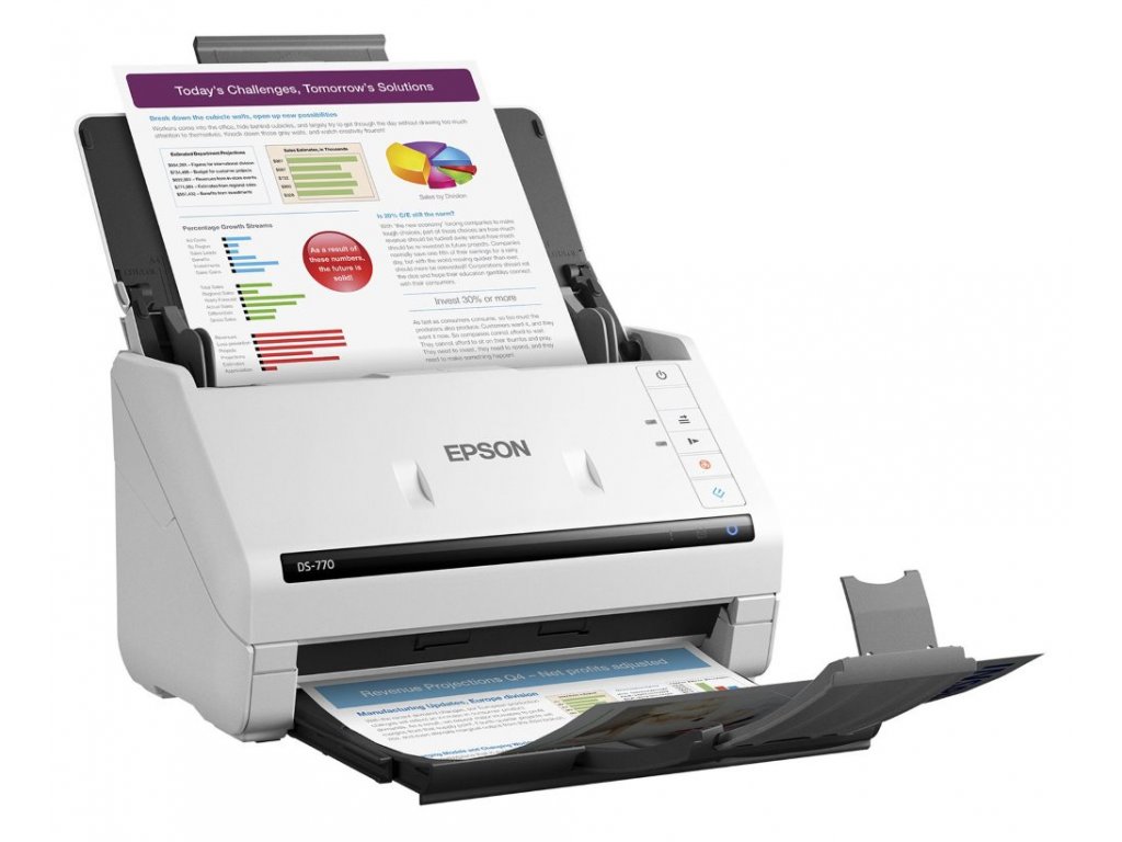 Epson WorkForce DS-770Inteligentní skener s podavačem listů a softwarem Document Capture Pro pro automatický přenos do systémů pro správu dokumentů. Díky vysoké rychlosti skenování 45 stran za minutu barevně i černobíle, zásobníku na 100 listů a rychlému zpracování dat se jedná o skvělou volbu pro snadnou práci s dokumenty.