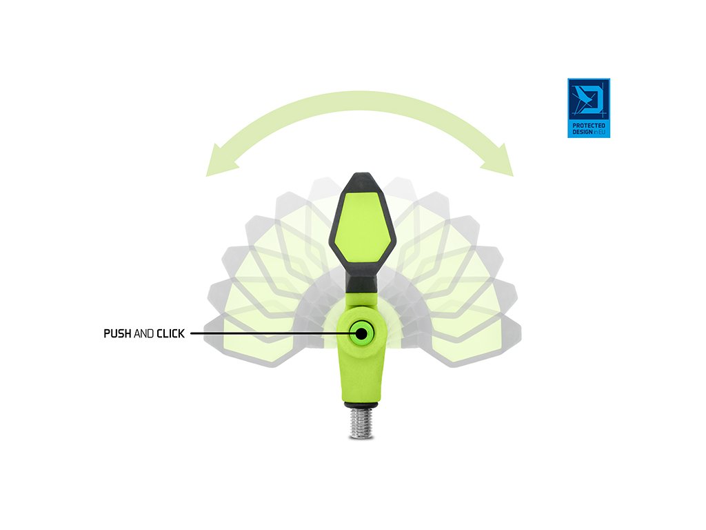 Prémiový feederový držák vysoké kvality v barvách inovativní feederové série Delphin Reaxe. Jak už název napovídá, model Flexi je plně naklápětelný pomocí jednoduchého mačkacího mechanismu, kterým umožňuje přizpůsobit se různému sklonu prutu, například během lovu na řece, ve větru nebo z nerovného terénu. Díky dostatečné šířce umožňuje upravit polohu prutu po nahození a tak docílit optimálního ohybu špičky bez potřeby nadměrného navíjení vlasce zpět na cívku navijáku. Držák je vyroben z odolných materiálů, takže se snadno nepoškodí a nepoškrábe. Jeho speciálně navržený tvar poskytuje dokonalou podporu prutu a zabrání jeho vysmeknutí i při razantních záběrech. Povrch držáku je potažen pogumovaným materiálem, který je extra šetrný k povrchu prutu a chrání jej před poškozením. Univerzální závit umožňuje uchycení na všechna standardní ramena, stojany a vidličky. Na závitové části se nachází gumová podložka, která zamezuje otáčení držáku. Držák Flexi lze použít i pro lov se dvěma pruty. Technické parametry: Celková délka: 215mmDoplňkové parametry