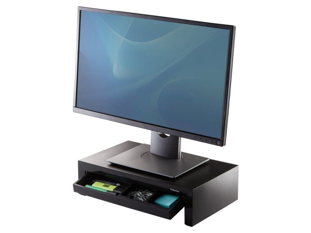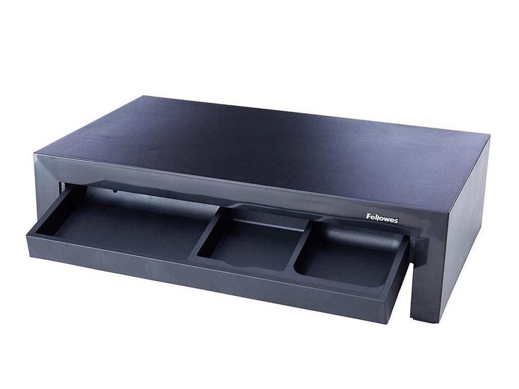 Fellowes Designer SuitesPraktický stojan pro monitor zvedá obrazovku na úroveň očí, čímž zmírňuje svalové napětí ramen a šíje. Umožňuje regulaci výšky od 11 do 15 cm. Díky svému praktickému designu ušetří místo na vašem pracovním stole. Propisovací tužky, obálky a další dokumenty lze uložit do šuplíku v přední části. Klávesnici či notebook lze poté schovat přímo pod samotný stojan. V klidu si také můžete odložit kávu, protiskluzové gumové nožičky se postarají o perfektní stabilitu.