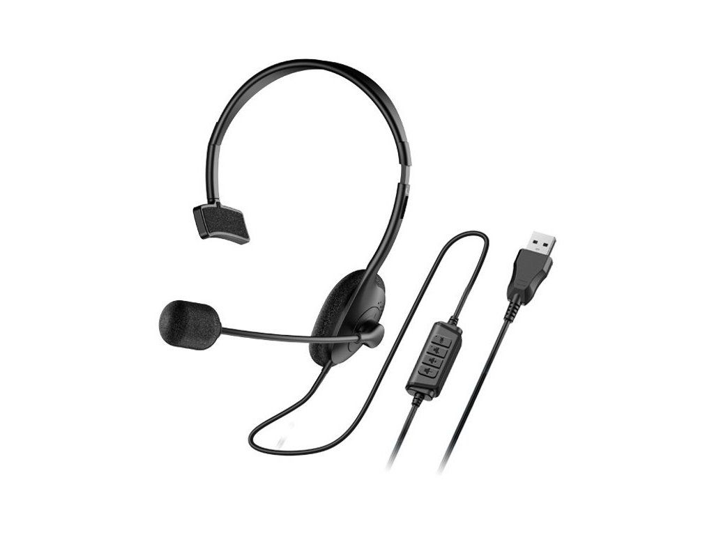 Genius HS-100ULehká náhlavní souprava na jedno ucho. Disponuje ovládáním přímo na kabelu a nastavitelným hlavovým mostem i mikrofonem. Připojení je realizováno skrze USB konektor.