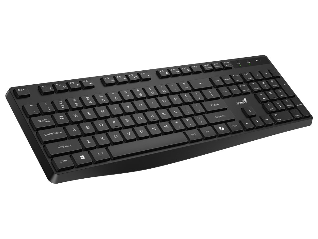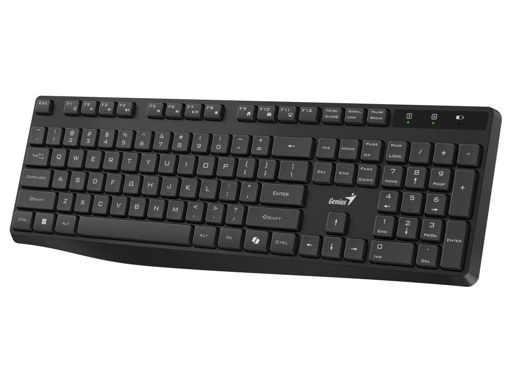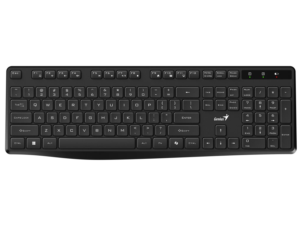 Genius KB-7200Bezdrátová klávesnice je navržena tak, aby uživateli poskytla maximální komfort při každodenní práci. Ergonomický sklon společně s klávesami typu chiclet umožňuje efektivní a pohodlné psaní. Je vybavena samostatnou klávesou pro vyvolání AI asistenta Microsoft Copilot v systému Windows 11. Připojení je realizováno skrze technologii 2,4 GHz a miniaturní USB přijímač. Napájení mají na starost dvě AAA baterie, které jsou součástí balení.