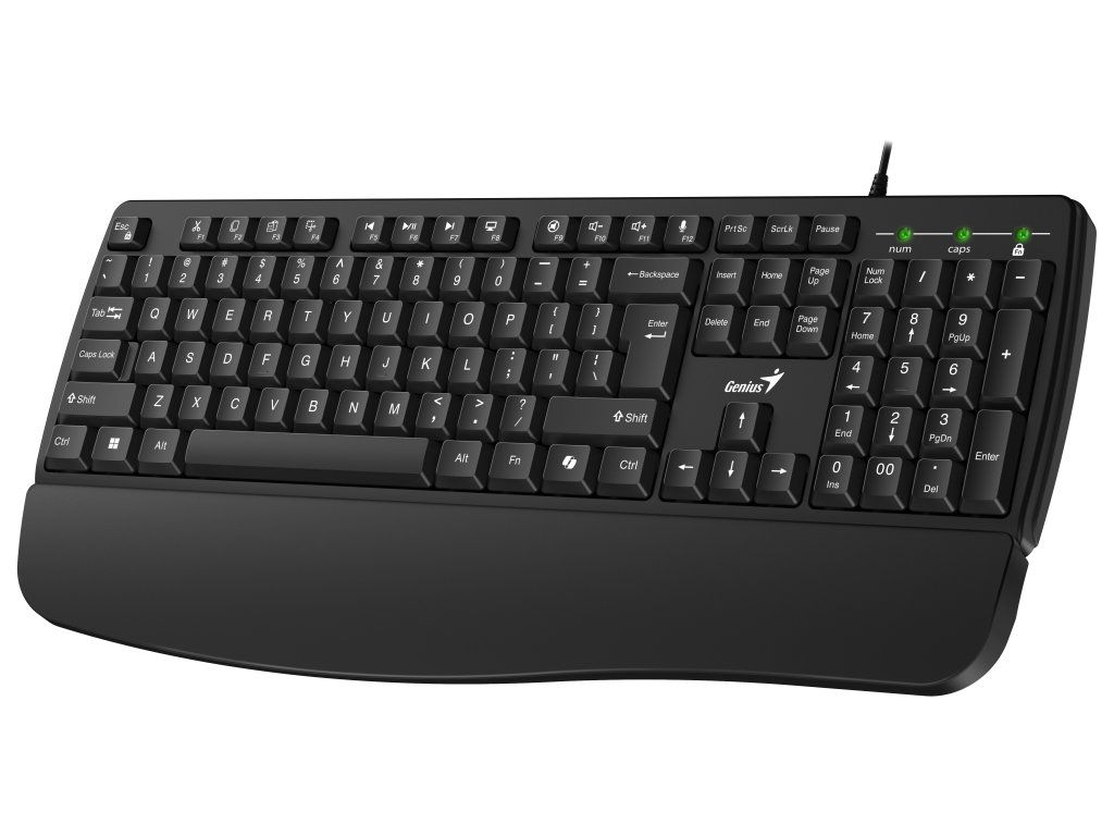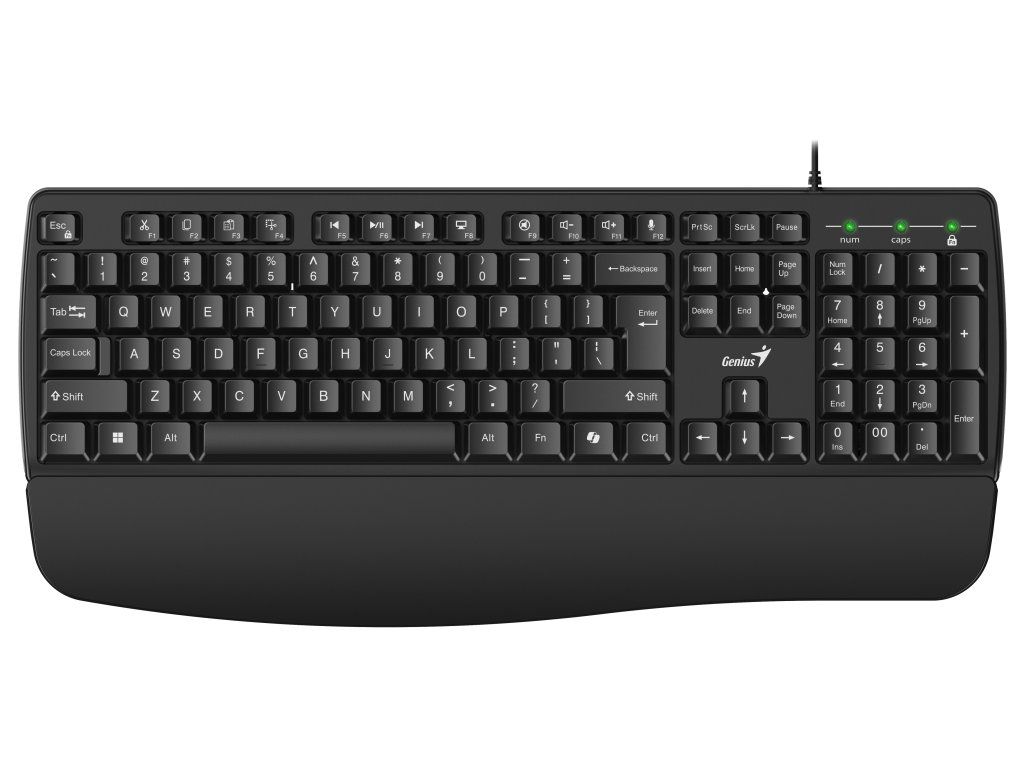 - Drátová klávesnice s ergonomickou opěrkou zápěstí pro pohodlné dlouhodobé psaní