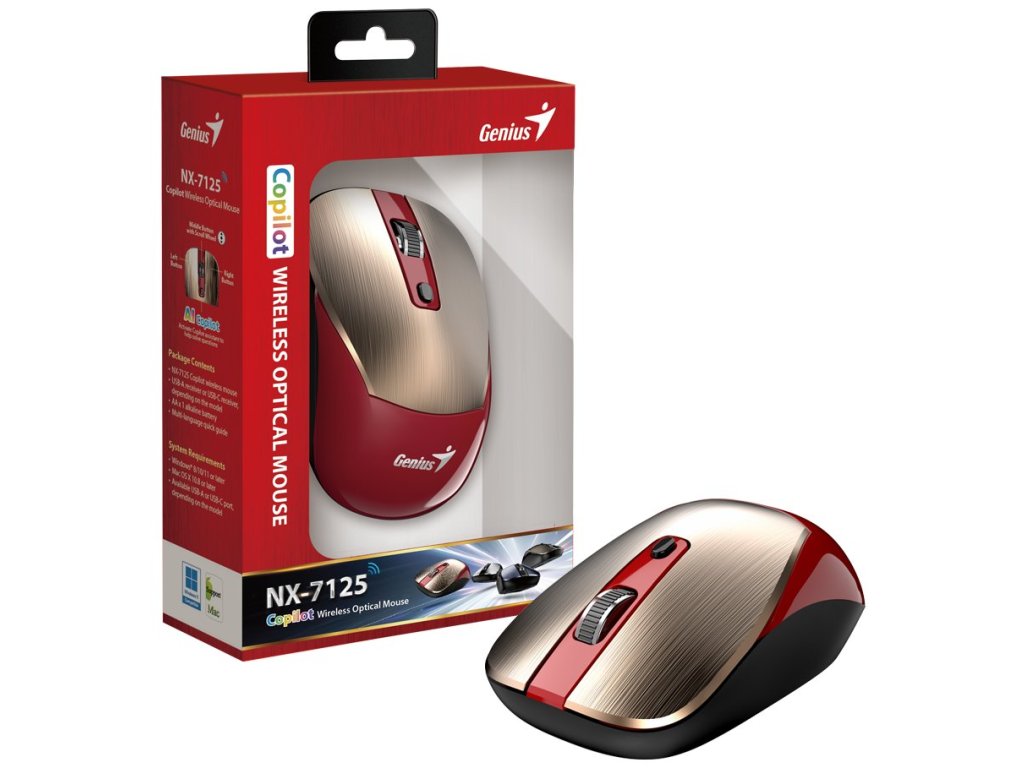 Genius NX-7125Bezdrátová myš disponující optickým senzorem s rozlišením 1200 DPI. Připojení k počítači je realizováno bezdrátově skrze miniaturní USB-A přijímač a rozhraní 2,4 GHz. Myš je vybavena samostatným tlačítkem pro vyvolání AI asistenta Microsoft Copilot (pouze ve Windows 11). Napájení zajišťuje jedna AA baterie.