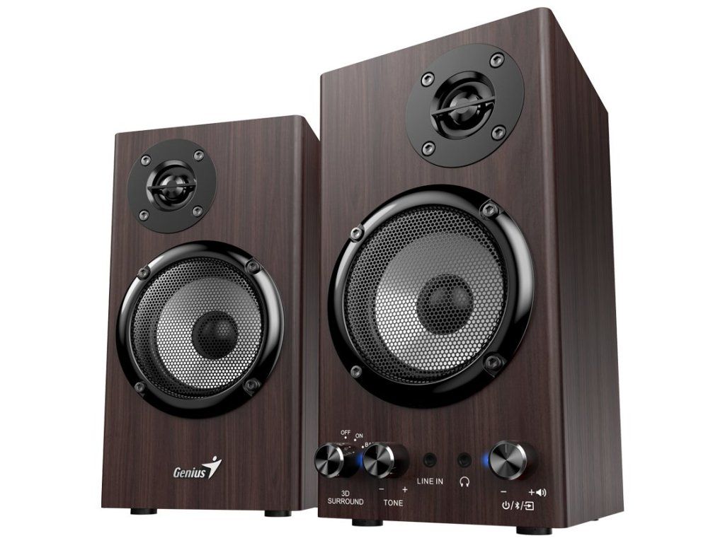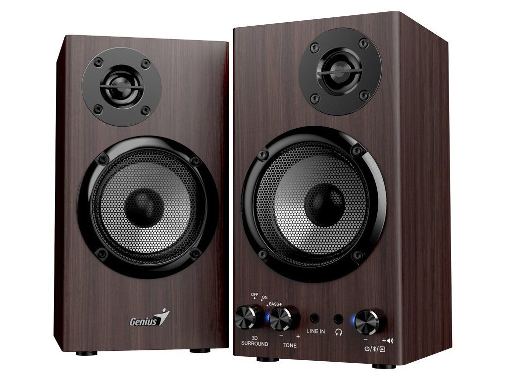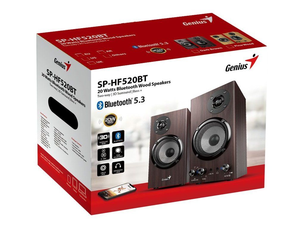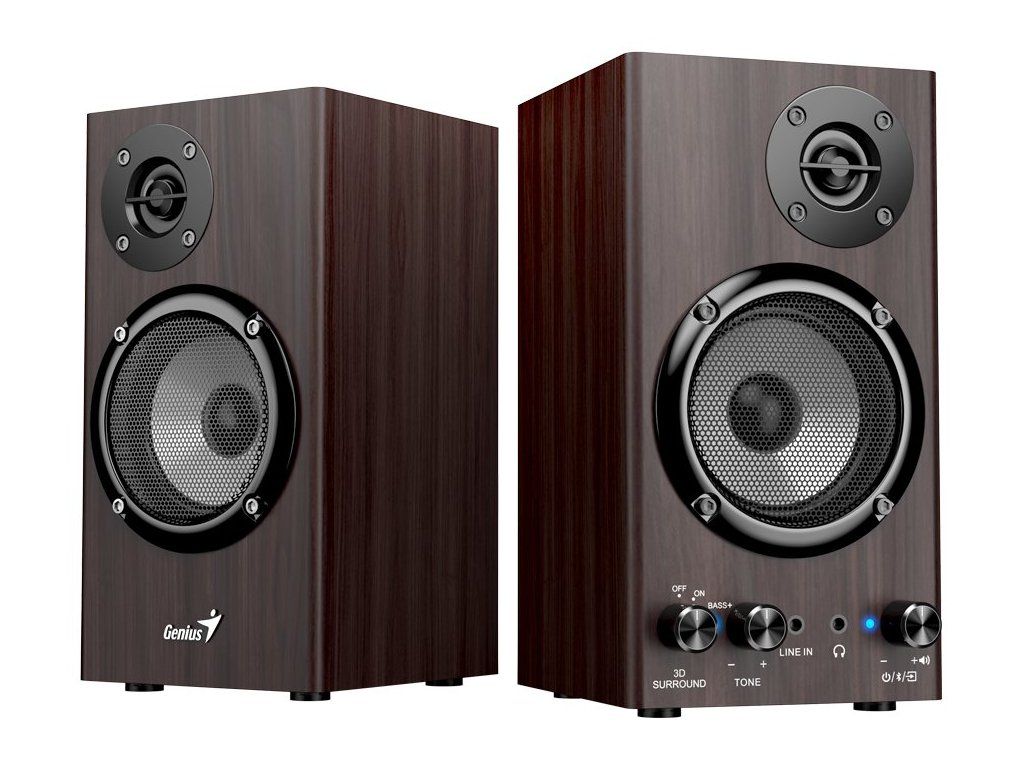 Genius SP-HF520BTSada reproduktorů s 3D prostorovým efektem v konfiguraci 2.0 s celkovým výkonem 20 W. Vyrobeny jsou ze dřeva pro docílení toho nejlepšího zvuku s plnými basy i zřetelnými výškami. Připojení k počítači, notebooku či chytrému telefonu lze jednoduše realizovat drátově skrze 3,5mm konektor či bezdrátově pomocí Bluetooth. K dispozici je také sluchátkový výstup a AUX vstup na přední straně. Potěší ovládání hlasitosti a tónů přímo na reproduktoru.