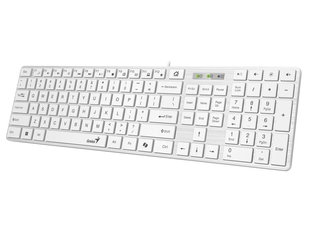 Genius Slimstar 126Elegantní drátová klávesnice v bílém provedení disponuje tenkým profilem a komfortním jemným sklonem. Díky tomu poskytuje uživateli maximální pohodlí při každodenní práci. Předností jsou také multimediální klávesy pro ztlumení zvuku, otevření e-mailu apod. Je vybavena samostatnou klávesou pro vyvolání AI asistenta Microsoft Copilot v systému Windows. Připojení k počítači je realizováno skrze USB port.