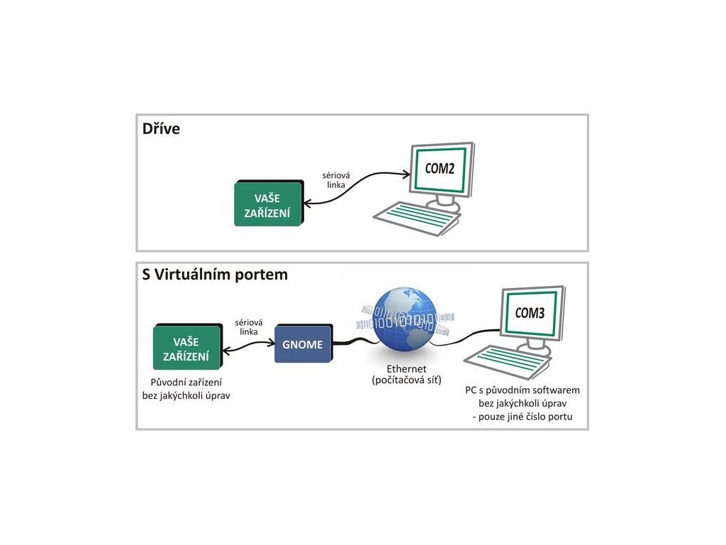 Součástí dodávky je „virtuální sériový port“, tedy software, které v operačním systému Windows vytvoří nový sériový port přesměrovaný přes Ethernet na modul GNOME232. Zapojení konektoru linky RS232 modulu GNOME232 je stejné jako konektoru RS232 na počítači typu PC. Lze tedy snadno použít i programy, které komunikují pouze přes sériový port a nejsou navrženy pro komunikaci přes Ethernet.