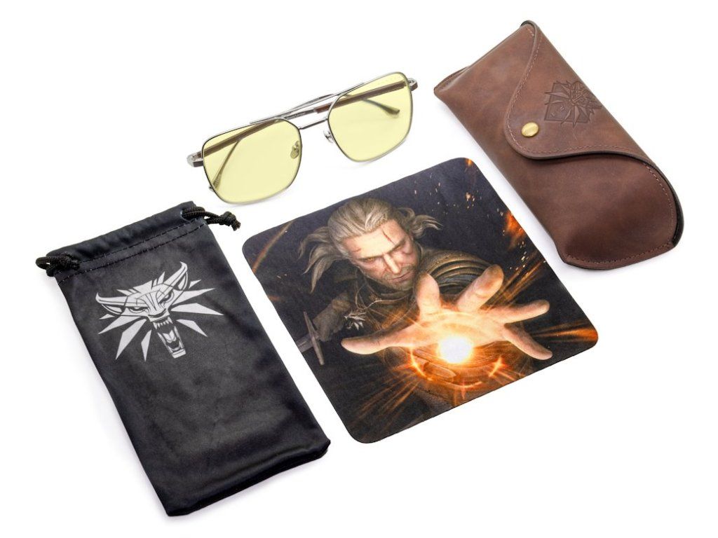 Každé brýle jsou dodávány s kompletním příslušenstvím včetně mikroplyšového čisticího hadříku s motivem zaklínače, ochranného pouzdra a prémiového pouzdra ve stylu zvětralé kůže.
