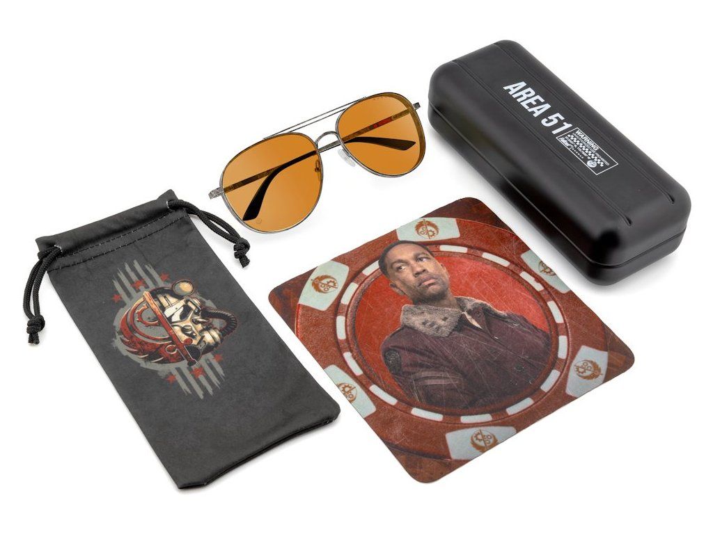 Každé brýle jsou dodávány s kolekcí exkluzivního příslušenství včetně kovového pouzdra „Area 51“, mikrovláknového pouzdra s motivy Brotherhood a čisticího hadříku s designem Fallout.