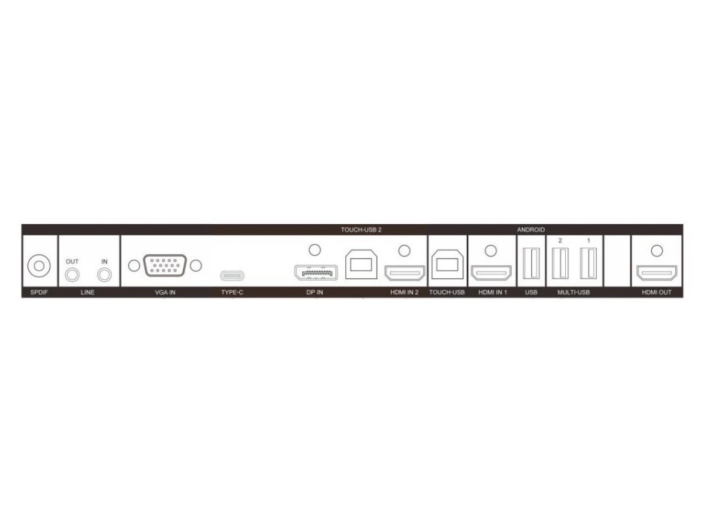 Rozhraní: Wi-Fi, 3× HDMI vstup, 1× HDMI výstup, 1× VGA vstup, 1× DisplayPort vstup, 1× audio vstup, 1× audio výstup, 1× S/PDIF (RCA), 2× USB-C, 4× USB 3.0, 1× USB 2.0, 3× USB 2.0 typ B pro dotykové ovládání, 1× RS-232, 2× RJ-45