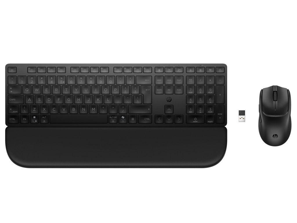 Bezdrátová klávesnice, bezdrátová myš, opěrka rukou, jednotný modul HP dongle, 1× baterie AA, 2× baterie AAA, úvodní příručka, záruční list, karta RED (pouze EMEA).