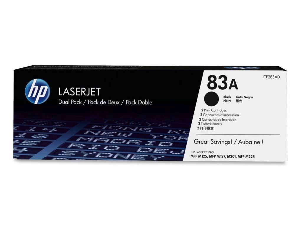 HP 83A (CF283AD) dvojpack černýBalení obsahuje 2 tiskové kazety.