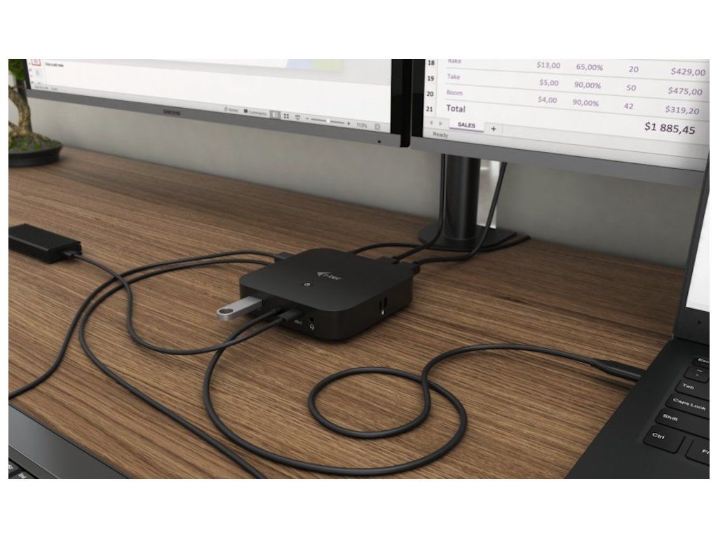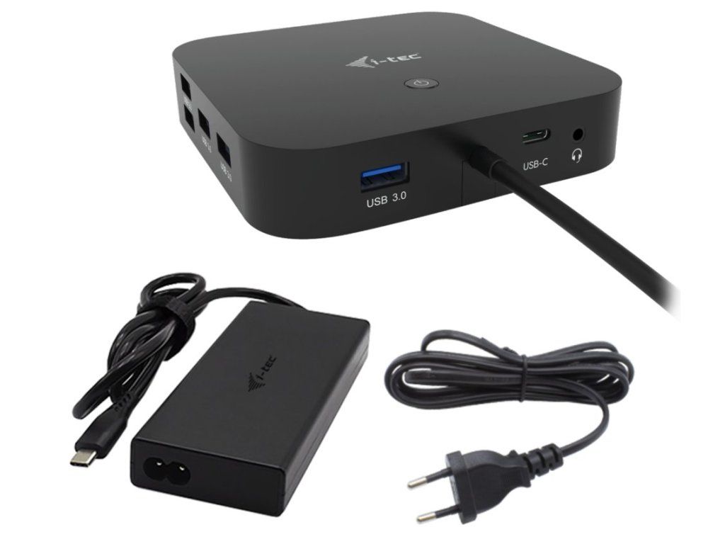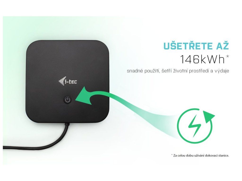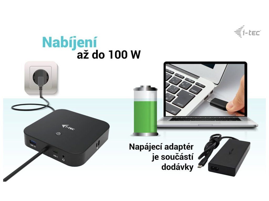 I-TEC USB-C HDMI DP Dock 100 WDokovací stanice podporující připojení dvou 4K monitorů. K počítači či notebooku se připojuje pomocí USB-C portu s podporou Thunderbolt 3 a je tak schopná na podporovaných zařízeních přenášet i napájení až 100 W. Vysokorychlostní přístup k internetu lze realizovat skrze přítomný RJ-45 port. Pro připojení periférií jsou přítomny tři USB 3.0 porty, dva USB 2.0 porty a dva porty USB-C. Pro připojení sluchátek či mikrofonu pak slouží kombinovaný 3,5 mm konektor. Potěší také slot pro bezpečnostní zámek nebo přepínač pro zapnutí a vypnutí stanice.