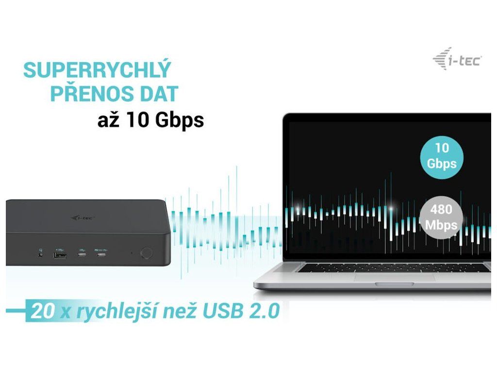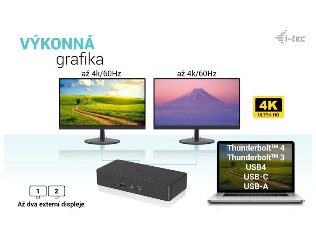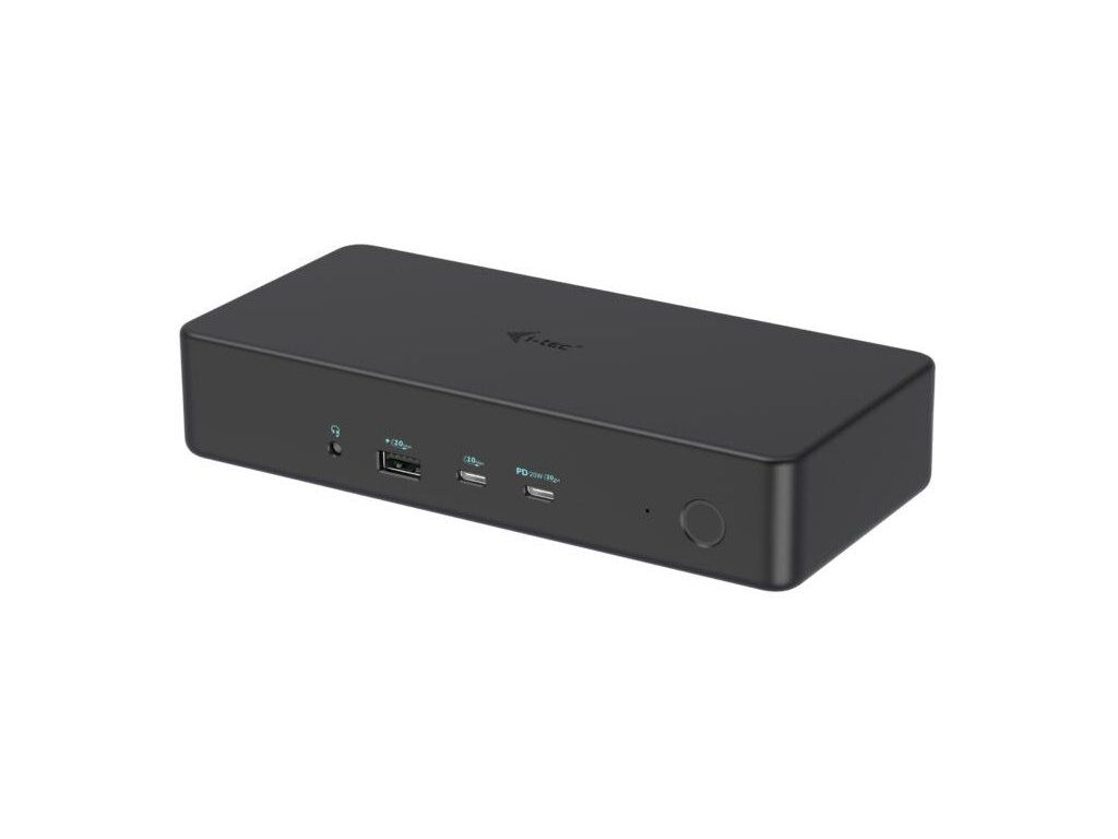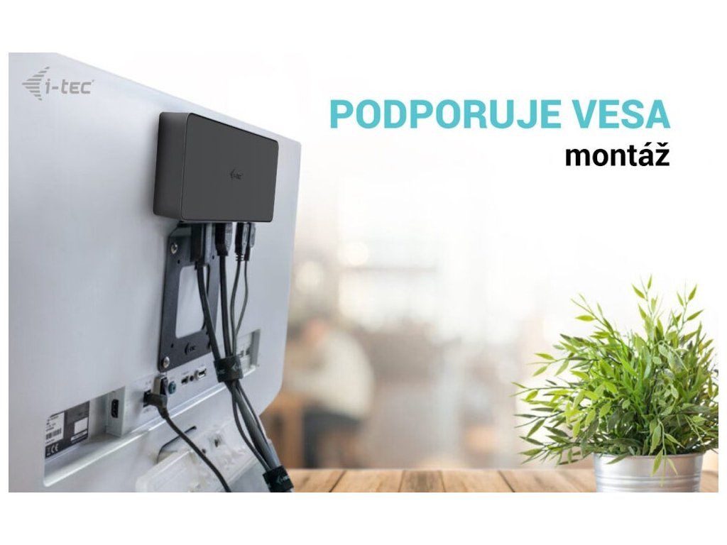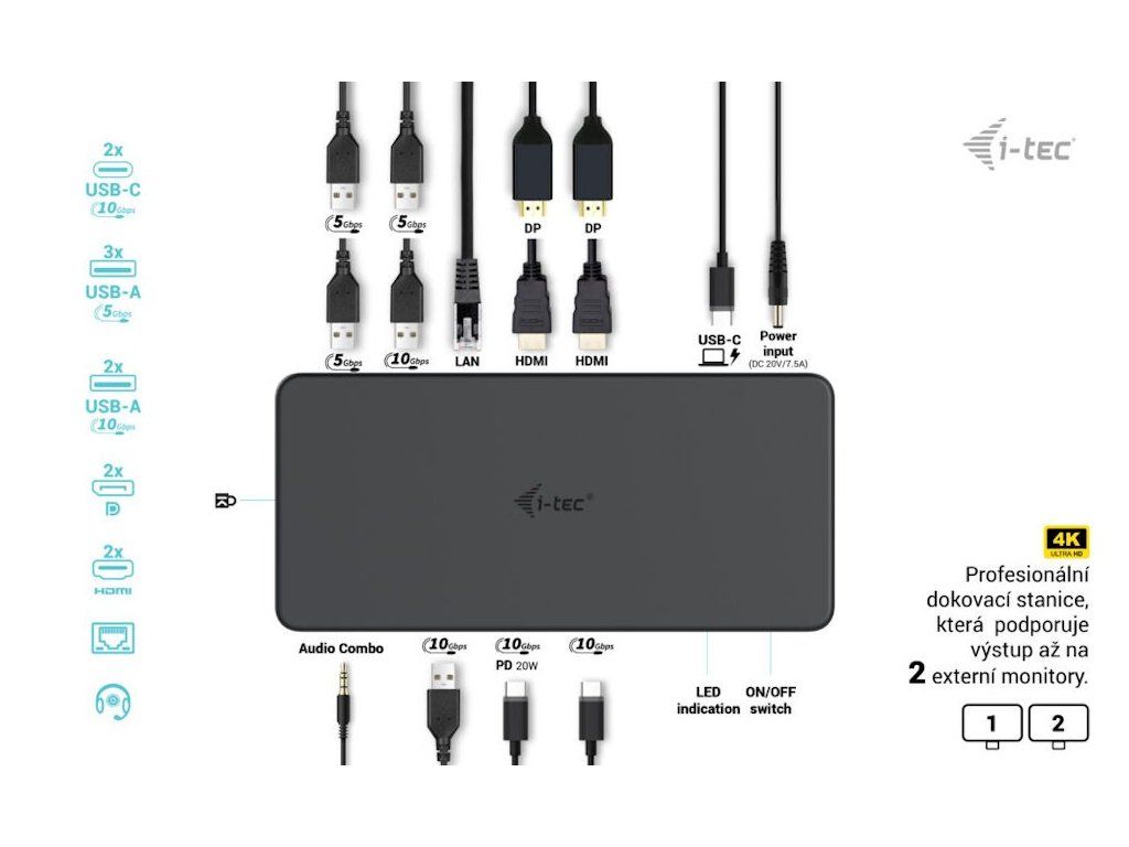 I-TEC Thunderbolt 3 Professional Dual 4K Dock 100 WVýkonná kancelářská dokovací stanice nabízející množství praktických portů. K počítači či notebooku se připojuje pomocí konektoru Thunderbolt 3/4 a je tak schopná na podporovaných zařízeních přenášet i napájení až 100 W. Pomocí přiložené redukce lze připojit i skrze konektor USB 3.0, v takovém případě není nabíjení podporováno. K dokovací stanici lze připojit až dva 4K monitory skrze porty HDMI a DisplayPort. Vysokorychlostní přístup k internetu zajišťuje přítomný RJ-45 port. Tři USB 3.0, dva USB 3.1 a dva USB-C porty poslouží pro připojení vašich periferií. Pro připojení sluchátek či mikrofonu pak slouží kombinovaný 3,5 mm konektor. Zajisté potěší i podpora VESA držáku pro přichycení za monitor.
