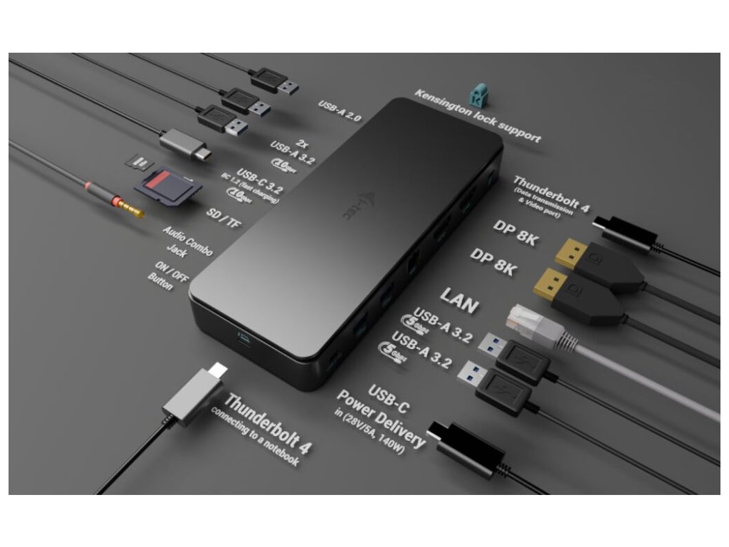 Křišťálově čistá kvalita obrazu, super-rychlý internet a schopnost přenášet data rychlostí až 40 Gb/s díky portům Thunderbolt 4. Dokovací stanice má dále USB-C 3.2 Gen2 (10 Gbps), 2× USB 3.2 Gen2 (10 Gbps), 2× USB 3.0 (5 Gbps) a 1× USB 2.0 port. Taktéž můžete samozřejmě připojit vaše sluchátka či reproduktor a nabíjet váš notebook (92 W), to vše za pomoci jednoho jediného kabelu. Disponuje čtečkou SD a microSD karet. Potěší také 2.5G LAN Ethernet, který zaručí rychlé internetové připojení. Díky integrovanému protokolu DP 1.4 můžete tuto dokovací stanici připojit k monitoru s rozlišením až 8K (7680 × 4320) s obnovovací frekvencí 30 Hz, což odpovídá rozlišení čtyř 4K monitorů. To z něj činí ideální řešení pro grafiky, analytiky, vývojáře, filmové střihače nebo nadšence a milovníky videa ve vysokém rozlišení. Samozřejmostí je vypínač či slot pro bezpečnostní zámek.