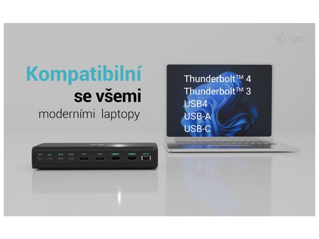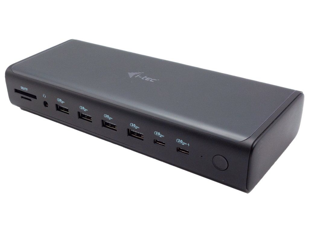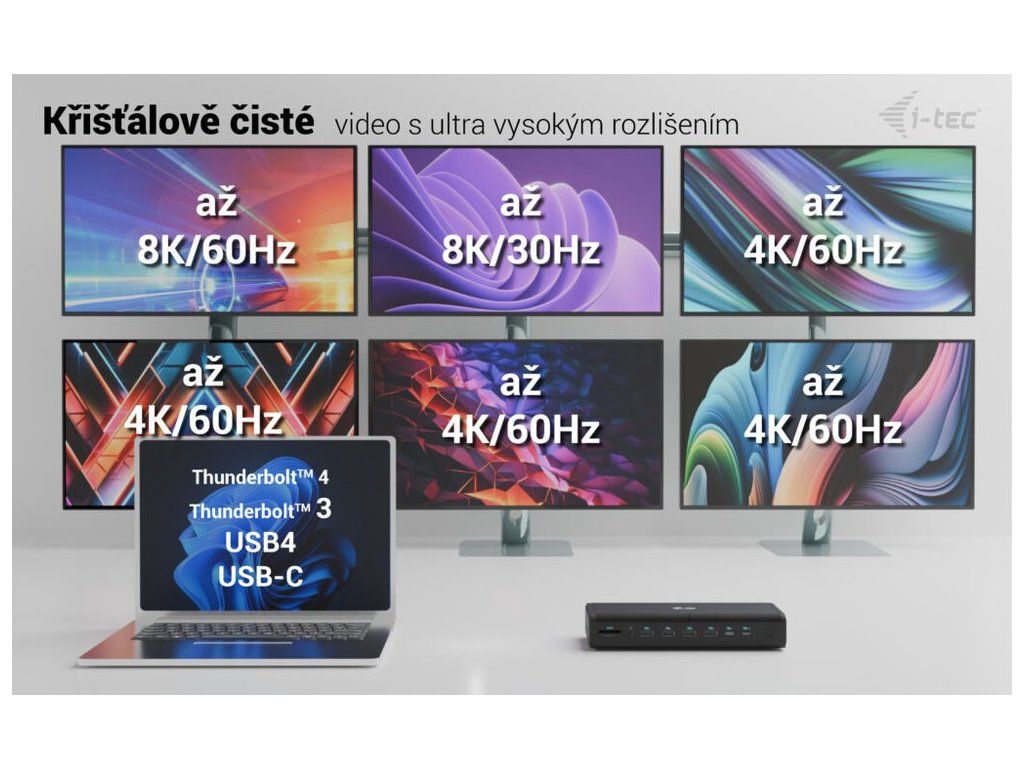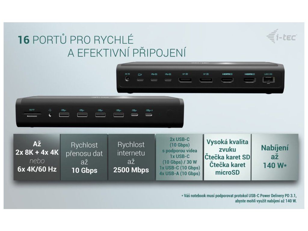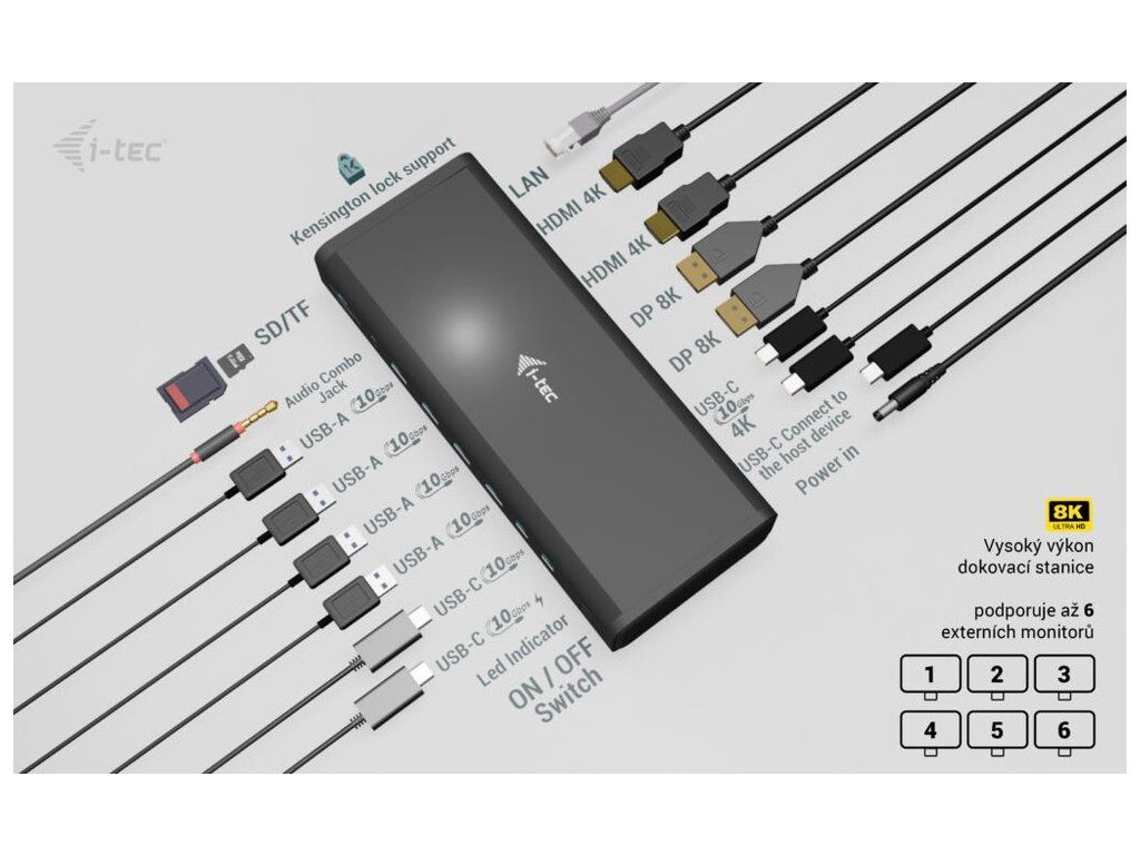 I-TEC Universal 6× 4K Display Docking Station 140 WDokovací stanice umožňuje připojit notebook, tablet nebo smartphone k dalším monitorům a hardwaru. K počítači či notebooku se připojuje pomocí USB-C portu s podporou Thunderbolt 3/4 a USB4. Na podporovaných zařízeních je tak schopna přenášet i napájení až 140 W v případě protokolu PD 3.1 nebo až 100 W u protokolu PD 3.0. K dokovací stanici je možné připojit současně šest 4K monitorů při 60 Hz. Vysokorychlostní přístup k internetu lze realizovat skrze přítomný RJ-45 port. Pro připojení periférií jsou přítomny čtyři USB-C a čtyři USB 3.1 porty. Dokovací stanici lze nainstalovat i dozadu za monitor s podporou VESA uchycení díky VESA držáku (není součástí), čímž získáte jak maximální pracovní efektivitu díky rozšiřitelnosti portů, tak i krásně uklizený stůl bez kabelů. Mimo to je k dispozici i čtečka microSD a SD karet. Pro připojení sluchátek či mikrofonu pak slouží kombinovaný 3,5 mm konektor. Potěší také slot pro bezpečnostní zámek a vypínač dokovací stanice pro maximální úsporu elektrické energie.