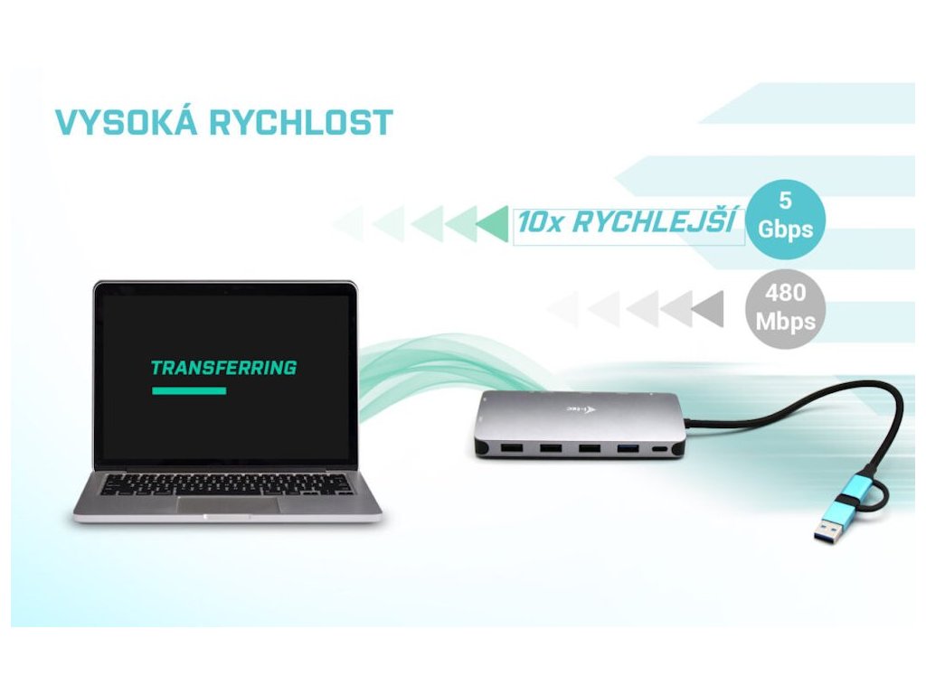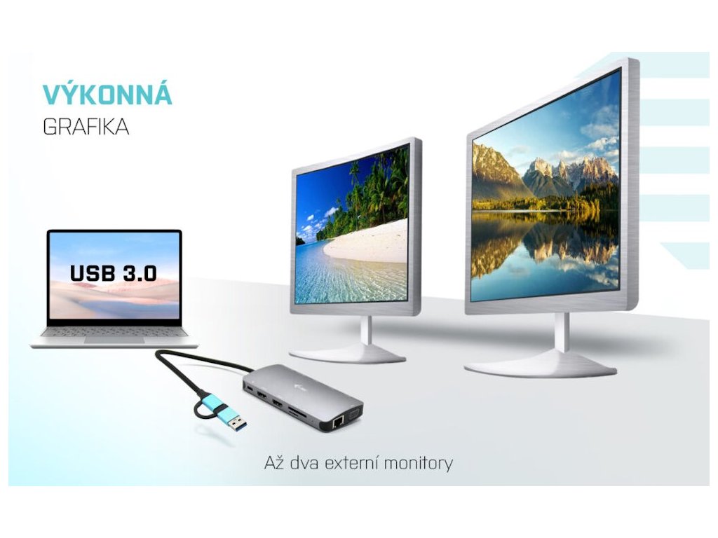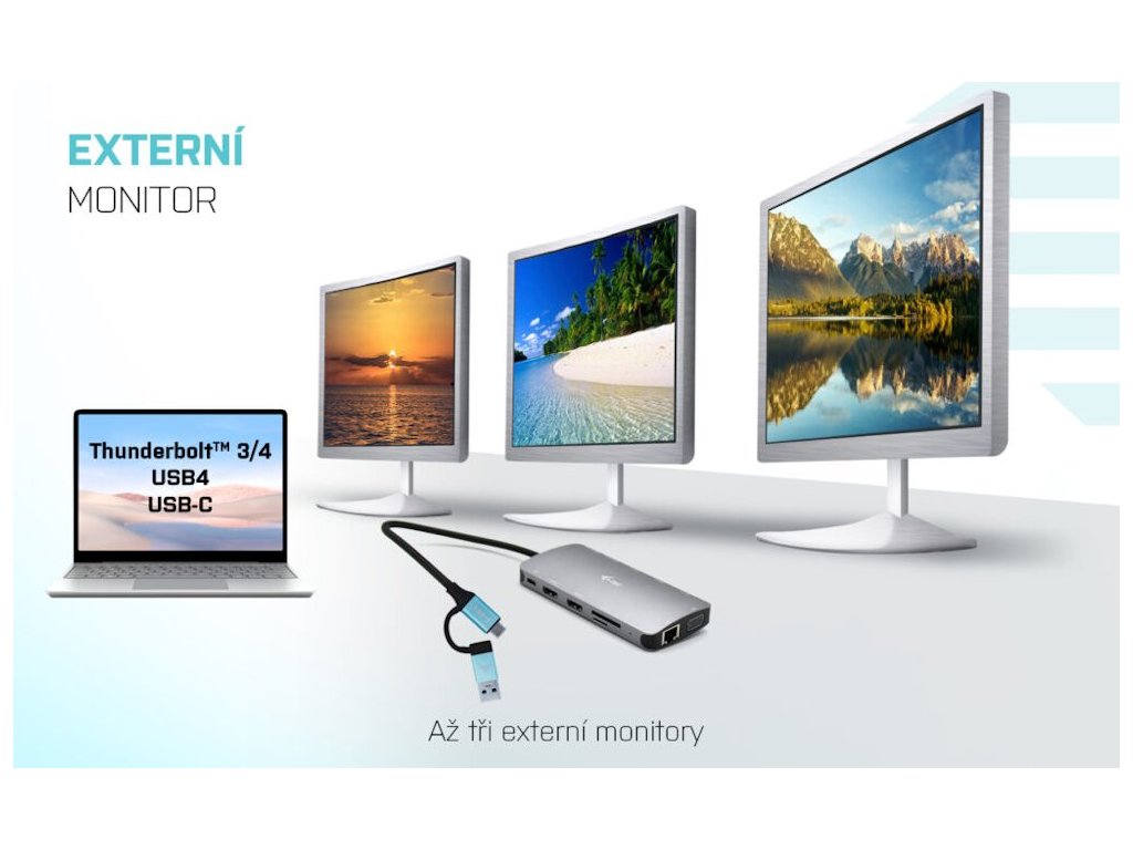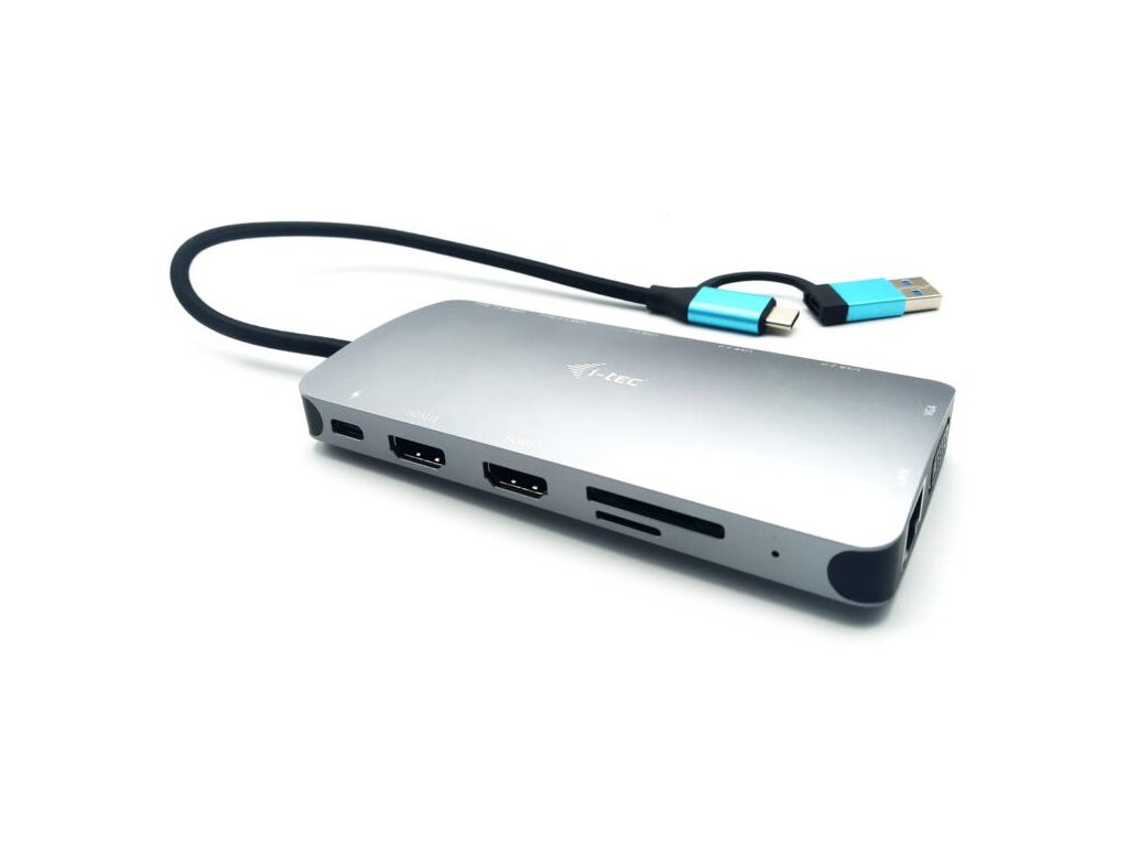 I-TEC USB 3.0/USB-C/Thunderbolt Metal Nano Dock 100 WDokovací stanice v kompaktním hliníkovém provedení nabízí velké množství praktických portů. K počítači či notebooku se připojuje pomocí USB 3.0 nebo USB-C portu s podporou Thunderbolt 3/4 a USB4. Je tak schopná na podporovaných zařízeních přenášet i napájení až 100 W. Vysokorychlostní přístup k internetu lze realizovat skrze přítomný RJ-45 port. K dokovací stanici lze připojit také až tři monitory skrze rozhraní HDMI a VGA. Maximální rozlišení v případě jednoho připojeného monitoru může být až 4K UHD při 30 Hz. Pro připojení periférií je přítomen USB 3.0 port, tři USB 2.0 porty a jeden USB-C port pro data. Mimo to je k dispozici i čtečka microSD a SD karet.