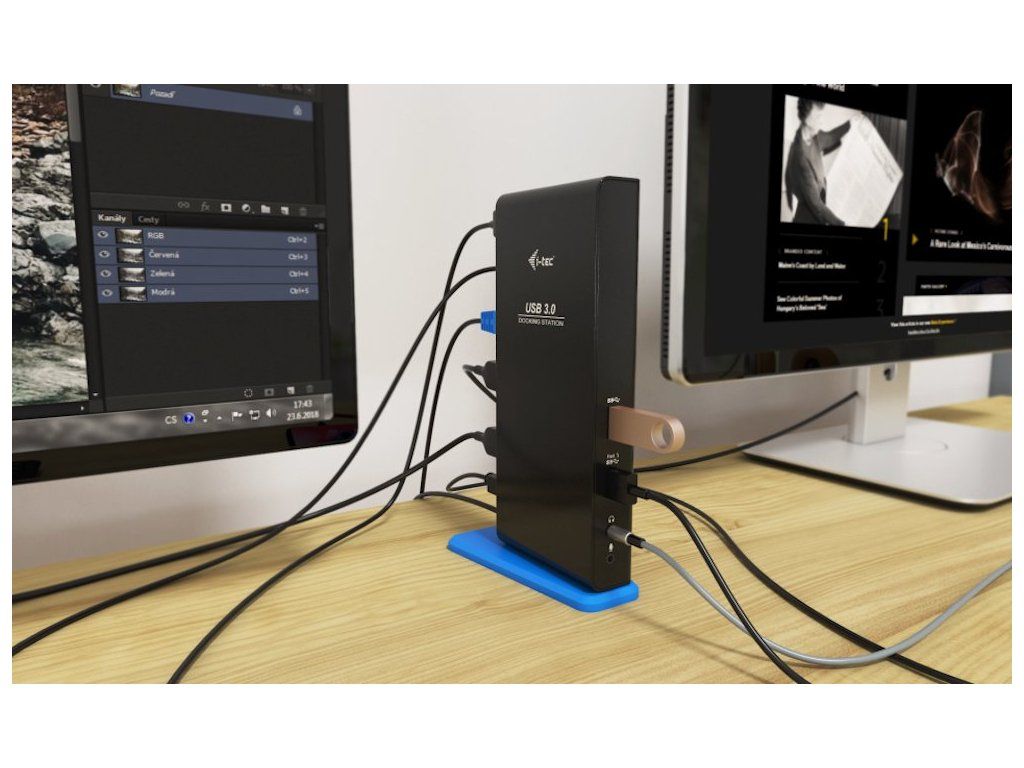 I-TEC USB 3.0 Dual HDMI DockUniverzální replikátor portů umožňuje připojit až dva HDMI monitory současně. V případě připojení pouze jednoho monitoru podporuje rozlišení až 2560 × 1440 bodů, v případě připojení dvou monitorů poté podporuje Full HD rozlišení 1920 × 1080 bodů. Pro připojení periferií jsou k dispozici čtyři porty USB 2.0 a dva porty USB 3.0, z nichž jeden nabízí podporu rychlého nabíjení. Gigabitový port RJ-45 poskytuje spolehlivé vysokorychlostní internetové připojení. Samozřejmě nechybí ani podpora audio vstupu a výstupu. Zařízení lze instalovat ve svislé poloze, nebo i horizontálně. V takovém případě může sloužit jako pohodlný podstavec pro váš notebook.