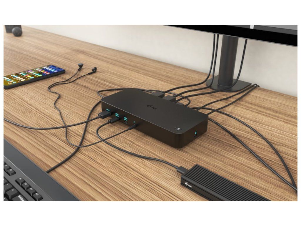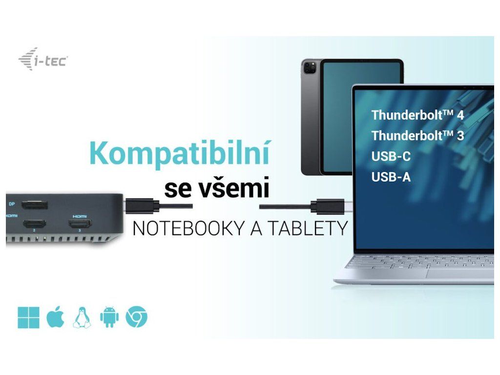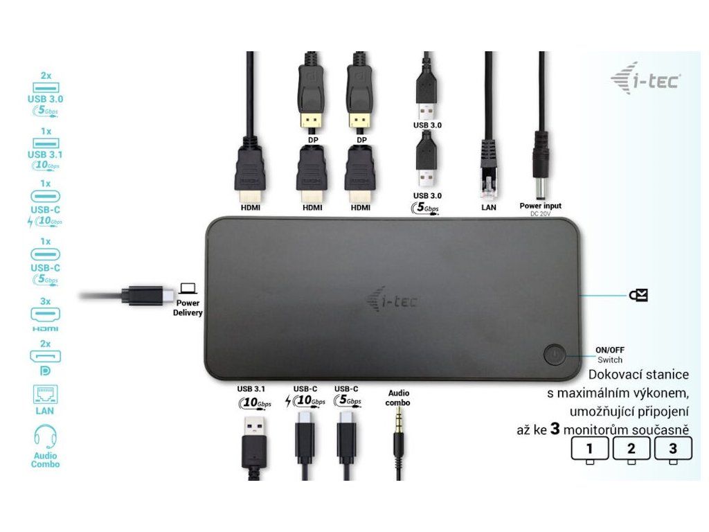 I-TEC CATRIPLEDOCKPDPRO 100 WDokovací stanice nabízející velké množství praktických portů. Připojení k počítači je realizováno skrze USB-C kabel s podporou Thunderbolt 3. Stanice taktéž nabízí USB-C Power Delivery až 100 W, který je určen pro napájení připojeného notebooku či tabletu pomocí vašeho originálního síťového adaptéru. K dokovací stanici lze připojit až tři monitory skrze rozhraní HDMI či DisplayPort s maximálním rozlišením až 4K. Připojení ke třem monitorům však bude možné pouze v případě notebooku s portem Thunderbolt 3/4, případně USB-C portem podporujícím přenos videa. Samozřejmostí jsou tři USB porty, spolehlivé a rychlé připojení k internetu díky integrovanému LAN portu a nechybí ani podpora audio vstupu/výstupu. Dokovací stanici lze nainstalovat i dozadu za monitor s podporou VESA uchycení díky VESA držáčku (není součástí), čímž získáte jak maximální pracovní efektivitu díky rozšiřitelnosti portů, tak i krásně uklizený stůl bez kabelů.