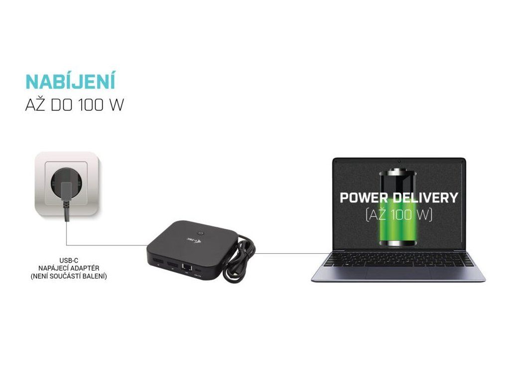 Bez použití napájecího adaptéru bude stanice fungovat pouze jako replikátor portů. Napájecí adaptér není součástí balení.
