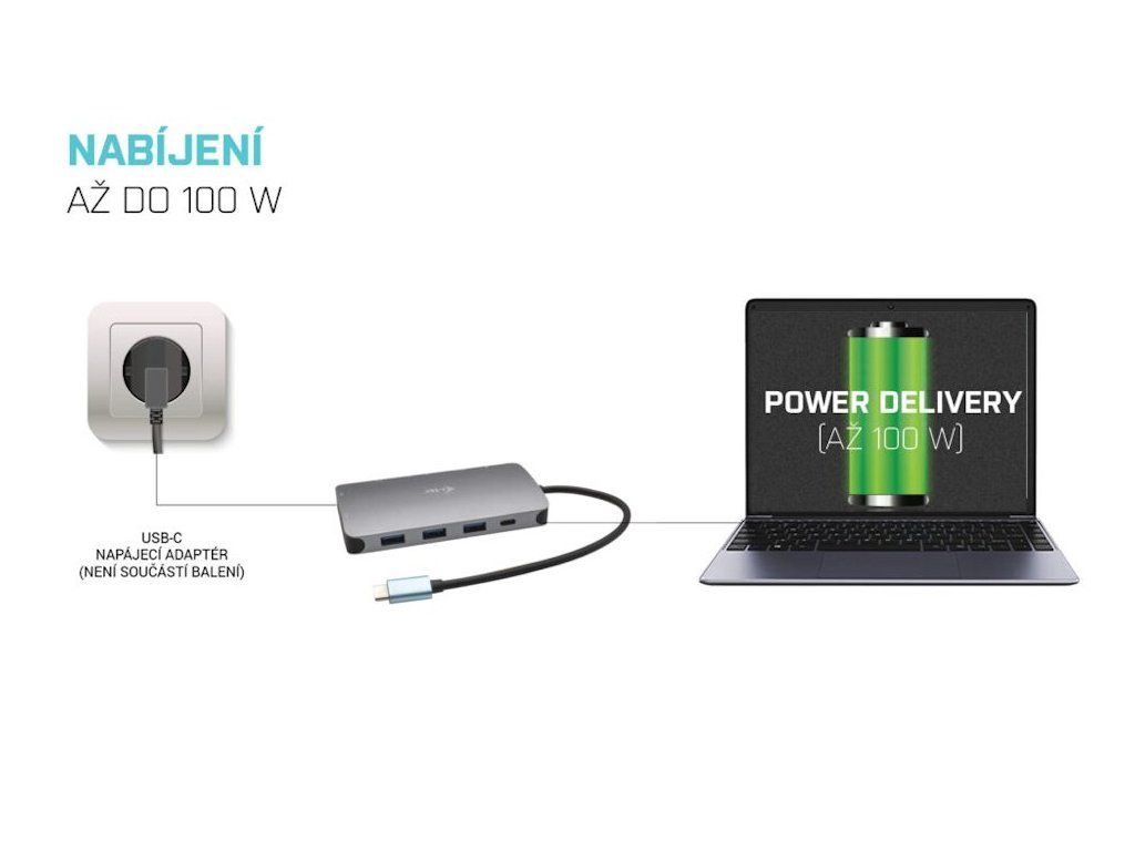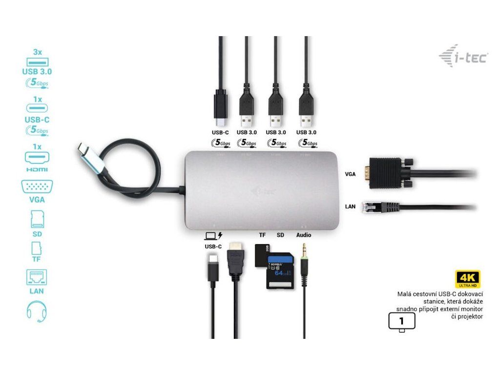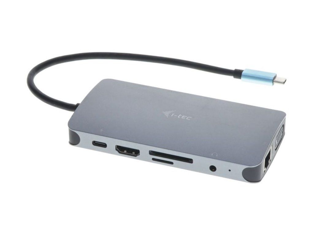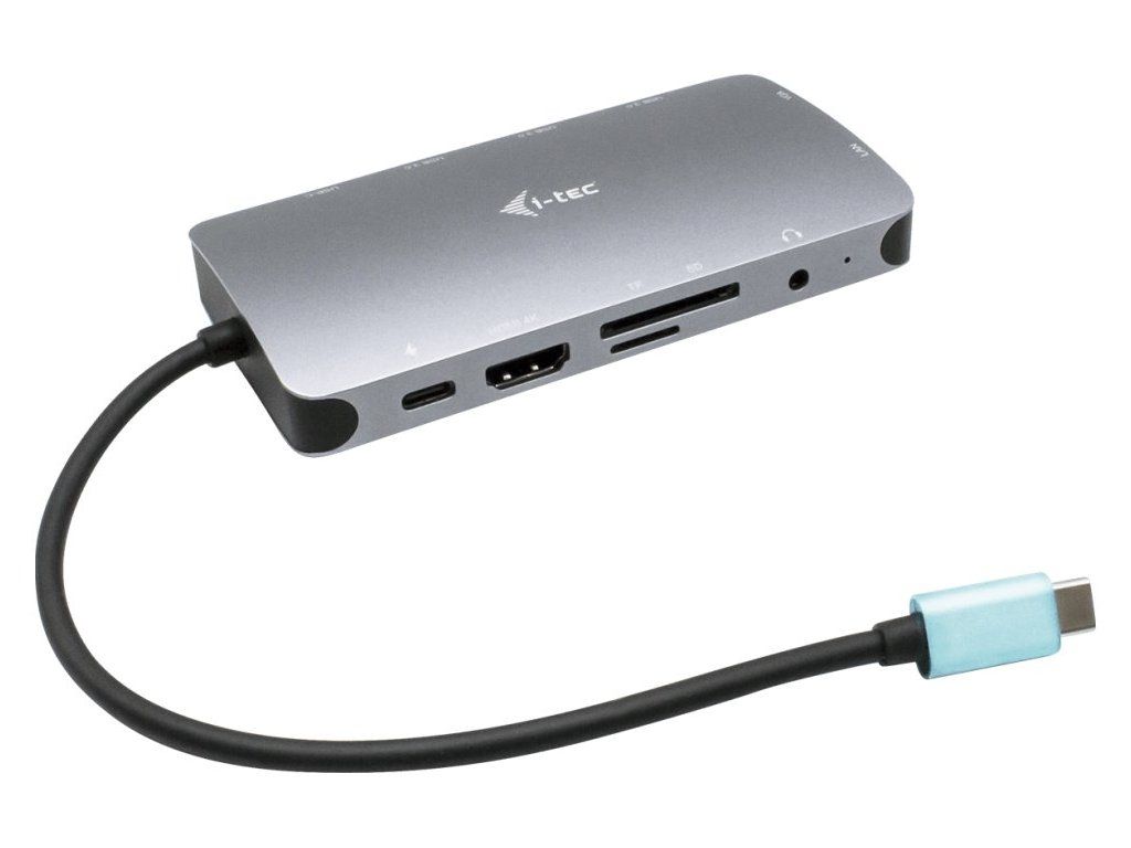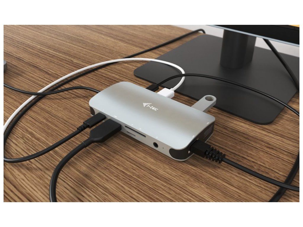 I-TEC USB-C Metal Nano Dock 100 WDokovací stanice vhodná pro uživatele pracující s 4K rozlišením. K počítači či notebooku se připojuje pomocí USB-C portu s podporou Thunderbolt 3 a je tak schopná na podporovaných zařízeních přenášet i napájení až 100 W. Kromě možnosti připojit jeden 4K monitor nabízí i volbu zapojit dva Full HD monitory. Vysokorychlostní přístup k internetu lze realizovat skrze přítomný RJ-45 port. Pro připojení periférií jsou přítomny tři USB 3.0 porty a jeden USB-C port pro data. Mimo to je k dispozici i čtečka microSD a SD karet. Pro připojení sluchátek či mikrofonu pak slouží kombinovaný 3,5 mm konektor.
