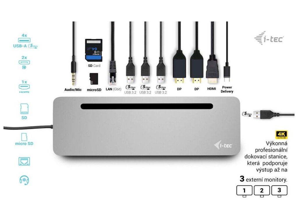 I-TEC USB-C Metal Ergonomic Dock 100 WErgonomická kovová dokovací stanice podporující připojení až tří monitorů. K počítači či notebooku se připojuje pomocí USB-C portu s podporou Thunderbolt 4 a je tak schopná na podporovaných zařízeních přenášet i napájení až 100 W. Vysokorychlostní přístup k internetu lze realizovat skrze přítomný RJ-45 port. Pro připojení periférií jsou přítomny čtyři USB 3.0 porty. Pro připojení sluchátek či mikrofonu pak slouží kombinovaný 3,5 mm konektor. Potěší také slot pro SD a microSD karty. Dock lze použít i jako praktický stojan pro notebook.