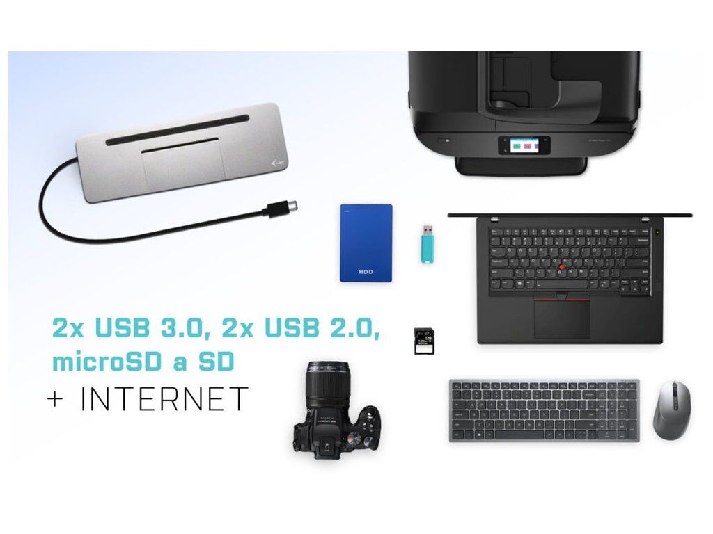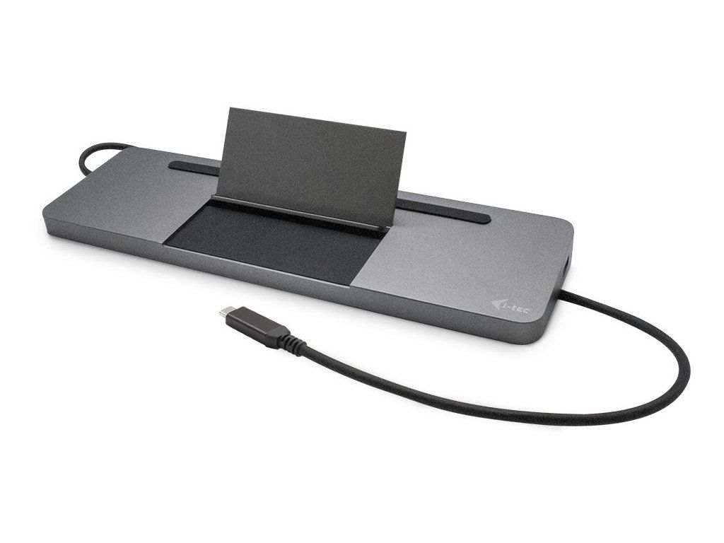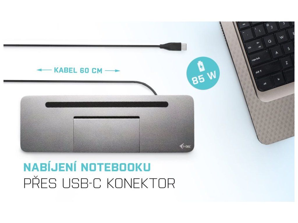 I-TEC USB-C Metal Ergonomic 4K Dock 85 WErgonomická kovová dokovací stanice podporující připojení až tří monitorů. K počítači či notebooku se připojuje pomocí USB-C portu s podporou Thunderbolt 3/4 a je tak schopná na podporovaných zařízeních přenášet i napájení až 85 W. Vysokorychlostní přístup k internetu lze realizovat skrze přítomný RJ-45 port. Pro připojení periférií jsou přítomny dva USB 3.0 porty a dva USB 2.0 porty. Pro připojení sluchátek či mikrofonu pak slouží kombinovaný 3,5 mm konektor. Potěší také slot pro SD a microSD karty. Dock lze použít i jako praktický stojan pro notebook či tablet.