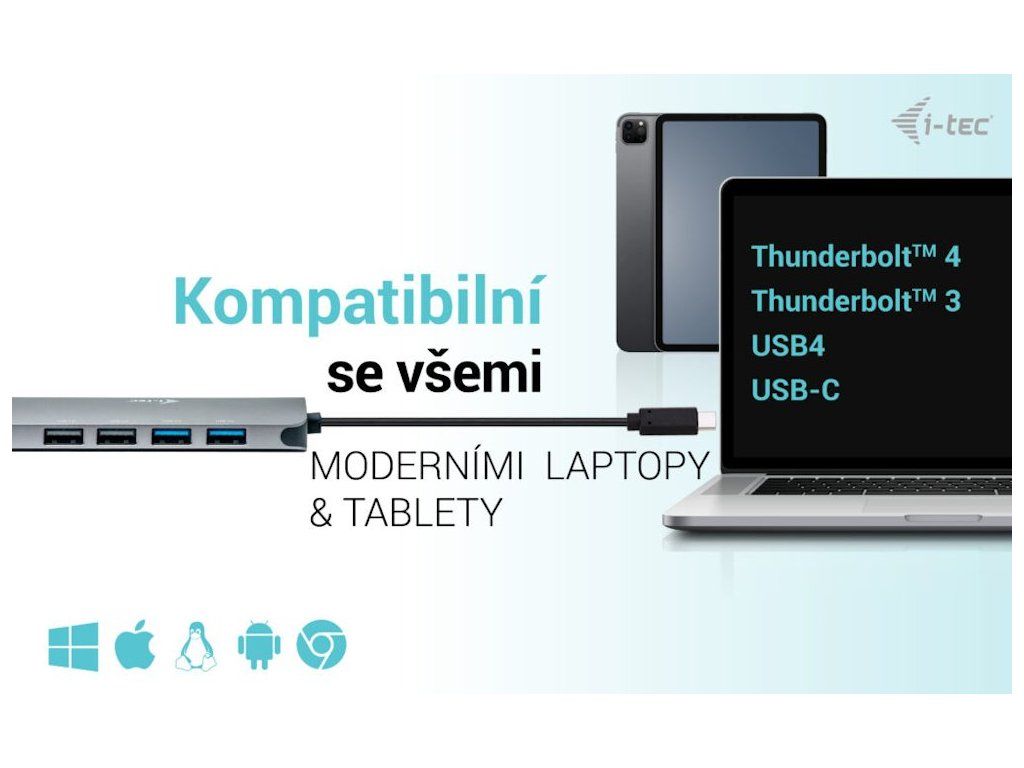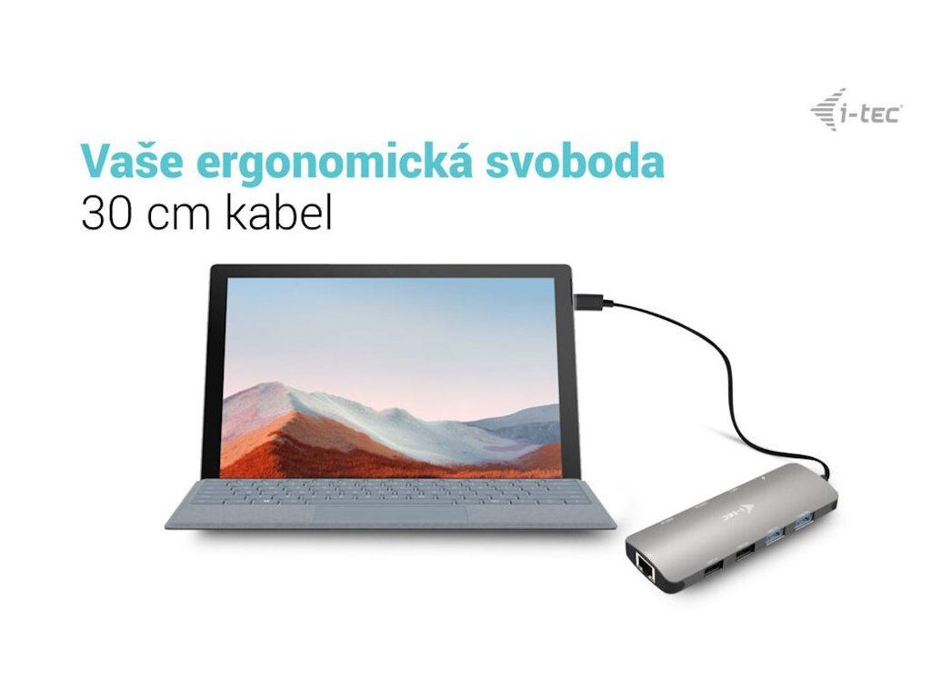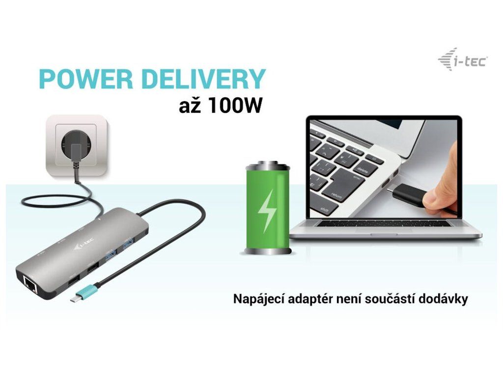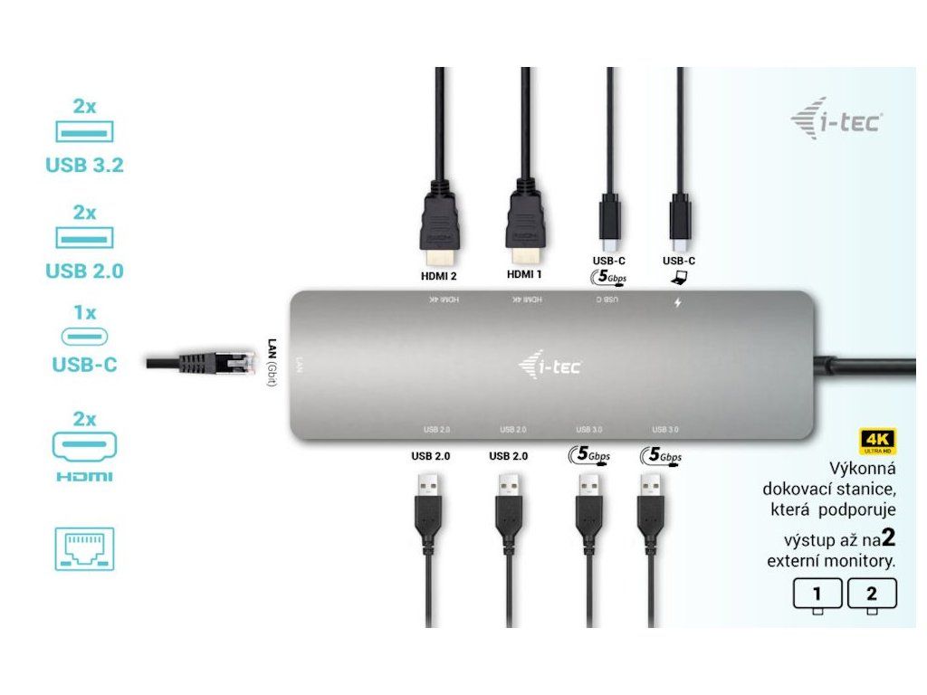 I-TEC USB-C Metal Nano Docking Station 100 WMalá kovová dokovací stanice vhodná pro uživatele pracující s 4K rozlišením. K počítači či notebooku se připojuje pomocí USB-C portu s podporou Thunderbolt 4 a je tak schopná na podporovaných zařízeních přenášet i napájení až 100 W. Kromě možnosti připojit jeden 4K monitor nabízí i volbu zapojit dva 1440p monitory. Vysokorychlostní přístup k internetu lze realizovat skrze přítomný RJ-45 port. Pro připojení periférií jsou přítomny dva USB 3.0 porty, dva USB 2.0 porty a dva USB-C porty, jeden pro data a jeden s funkcí power delivery.