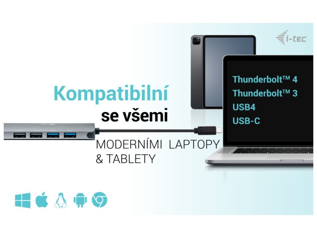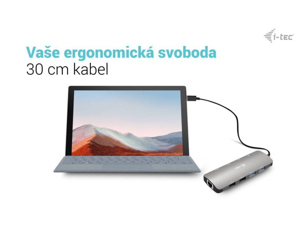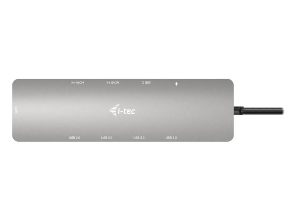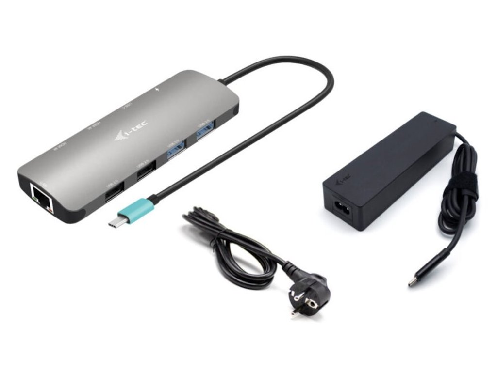 I-TEC USB-C Metal Nano Dock 100 W + nabíječkaMalá kovová dokovací stanice podporující připojení dvou HDMI monitorů současně s rozlišením až 4K při 60 Hz. K počítači či notebooku se připojuje pomocí USB-C portu s podporou Thunderbolt 3/4 a je tak schopná na podporovaných zařízeních přenášet i napájení až 100 W. Pro připojení periférií jsou přítomny dva USB 3.0 porty, dva USB 2.0 porty a USB-C 3.2 Gen1 port. Gigabitový RJ-45 ethernetový port poskytuje spolehlivé vysokorychlostní připojení k internetu.