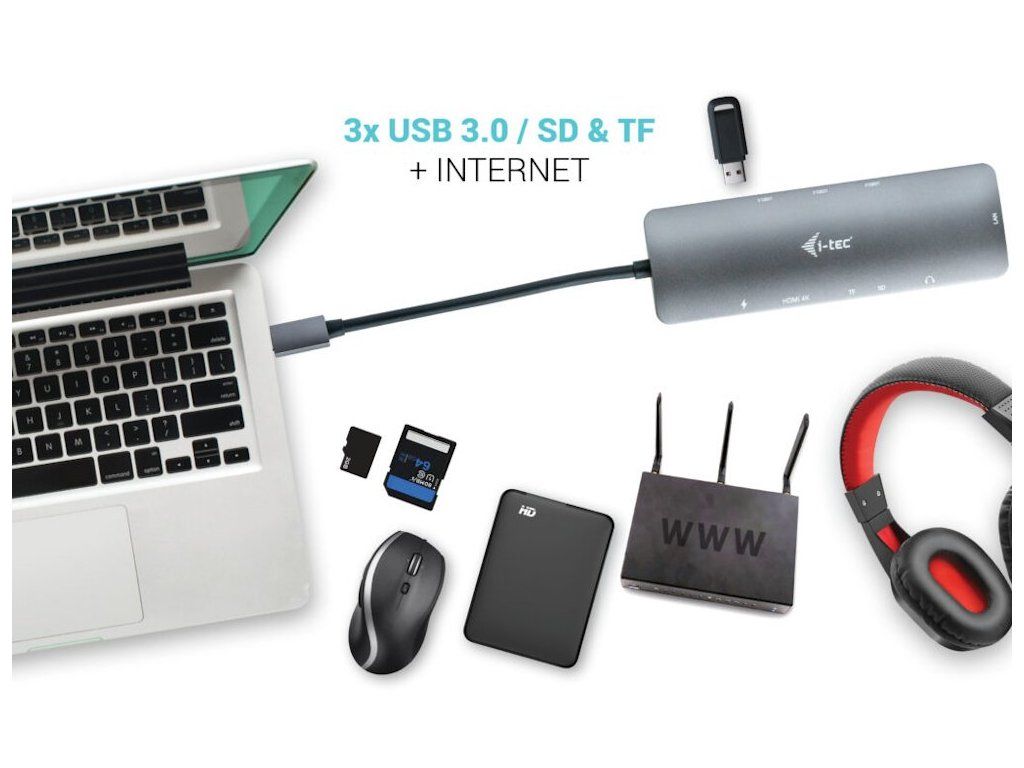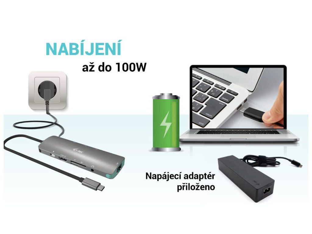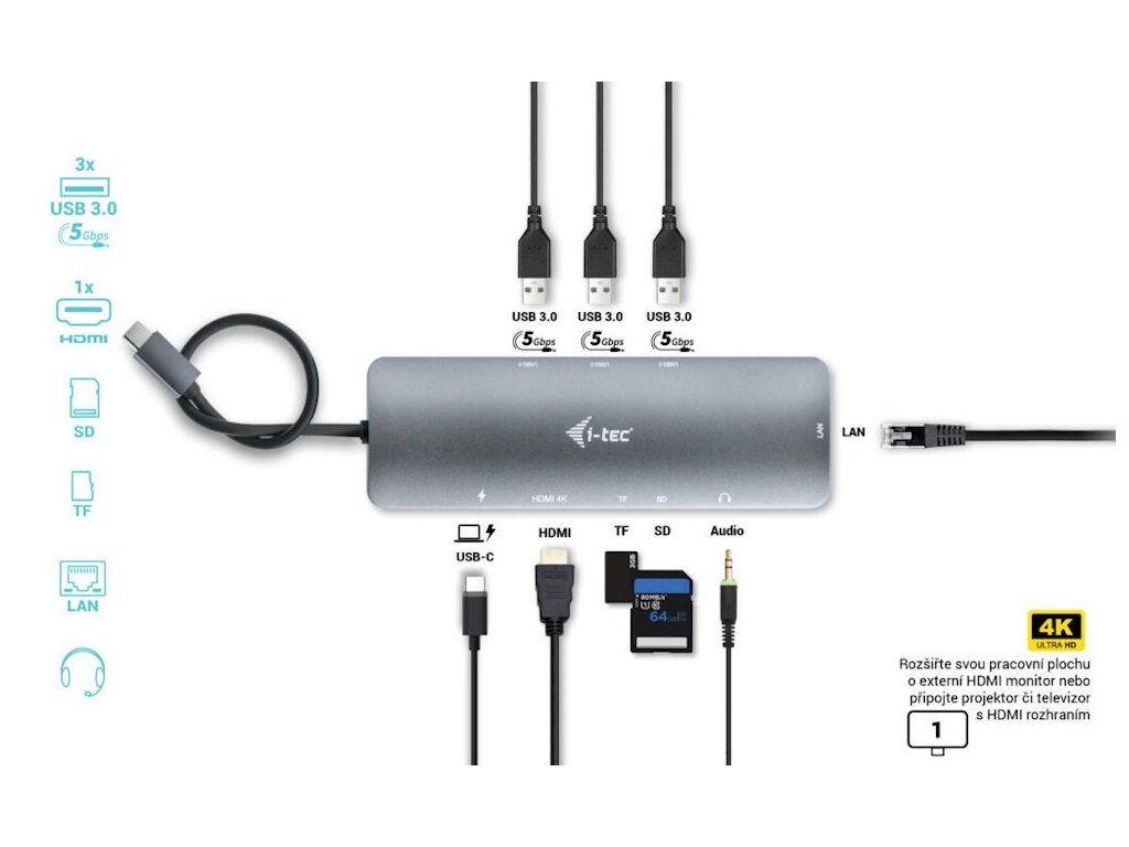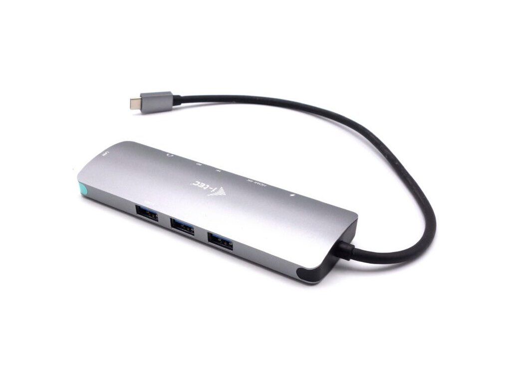 I-TEC USB-C Metal Nano Dock 4K HDMI/LAN 100 W + nabíječkaKompaktní dokovací stanice podporující připojení externího HDMI monitoru s rozlišením až 4K při 60 Hz. K počítači či notebooku se připojuje pomocí USB-C portu s podporou Thunderbolt 3/4 a USB4. Na podporovaných zařízeních je tak schopna přenášet i napájení až 100 W s využitím technologie Power Delivery 3.0. Pro připojení periférií jsou přítomny tři USB 3.0 porty. Gigabitový RJ-45 ethernetový port poskytuje spolehlivé vysokorychlostní připojení k internetu. Mimo to je k dispozici i čtečka microSD a SD karet. Pro připojení sluchátek či mikrofonu pak slouží kombinovaný 3,5 mm konektor.