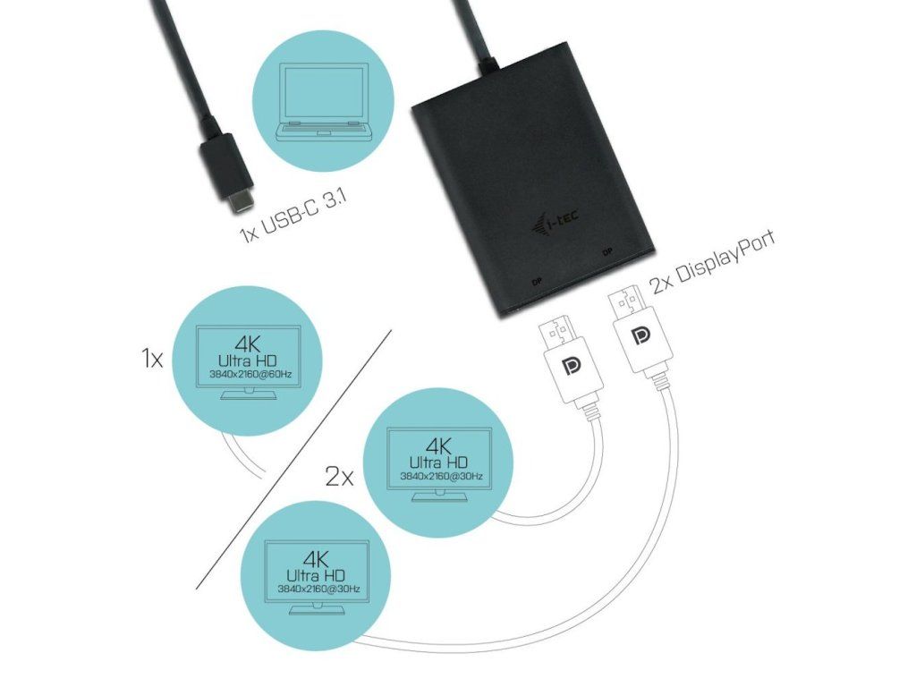 I-TEC USB-C na dual DisplayPortAdaptér I-TEC USB-C na dual DisplayPort umožňuje rozšíření vaší pracovní plochy o dva externí Display Port monitory přes USB-C nebo Thunderbolt 3 konektor. Adaptér podporuje přenos 4K Ultra HD rozlišení až 3840 × 2160 pixelů při 30 Hz včetně audio signálu. Díky němu si můžete užívat filmů na domácím projektoru, udělat ze stolního počítače rozšířenou pracovní stanici nebo ve škole či v práci představovat prezentace. K notebookům Apple je možné připojit pouze jeden monitor, žadný USB-C adaptér nepodporuje připojení dvou monitorů v Mac OS, toto zvládá pouze Thunderbolt 3 adaptér.