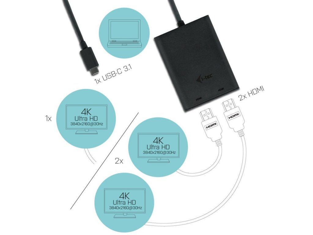 I-TEC USB-C na dual HDMIAdaptér I-TEC USB-C na dual HDMI umožňuje rozšíření vaší pracovní plochy o dva externí HDMI monitory přes USB-C nebo Thunderbolt 3 konektor. Adaptér podporuje přenos 4K Ultra HD rozlišení až 3840 × 2160 pixelů včetně audio signálu. Díky němu si můžete užívat filmů na domácím projektoru, udělat ze stolního počítače rozšířenou pracovní stanici nebo ve škole či v práci představovat prezentace. K notebookům Apple je možné připojit pouze jeden monitor, žadný USB-C adaptér nepodporuje připojení dvou monitorů v Mac OS, toto zvládá pouze Thunderbolt 3 adaptér.