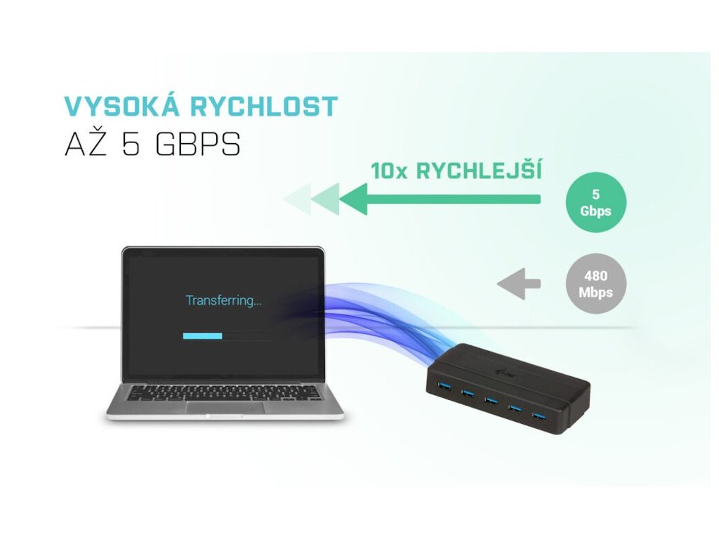 I-TEC Charging 7× USB 3.0USB hub I-TEC nabízí rozšíření o sedm USB 3.0 portů, z nichž dva podporují nabíjení s výstupem 2 A. Hub má vestavěnou přepěťovou ochranu pro případ zkratu na periferních zařízeních. Zařízení je kompatibilní s běžně používanými operačními systémy Windows, Mac OS X a Linux. Hub je dodáván s napájecím adaptérem a USB kabelem.