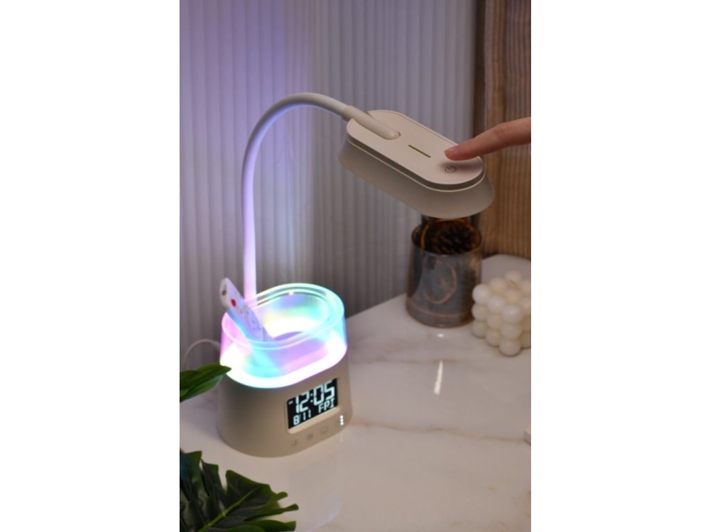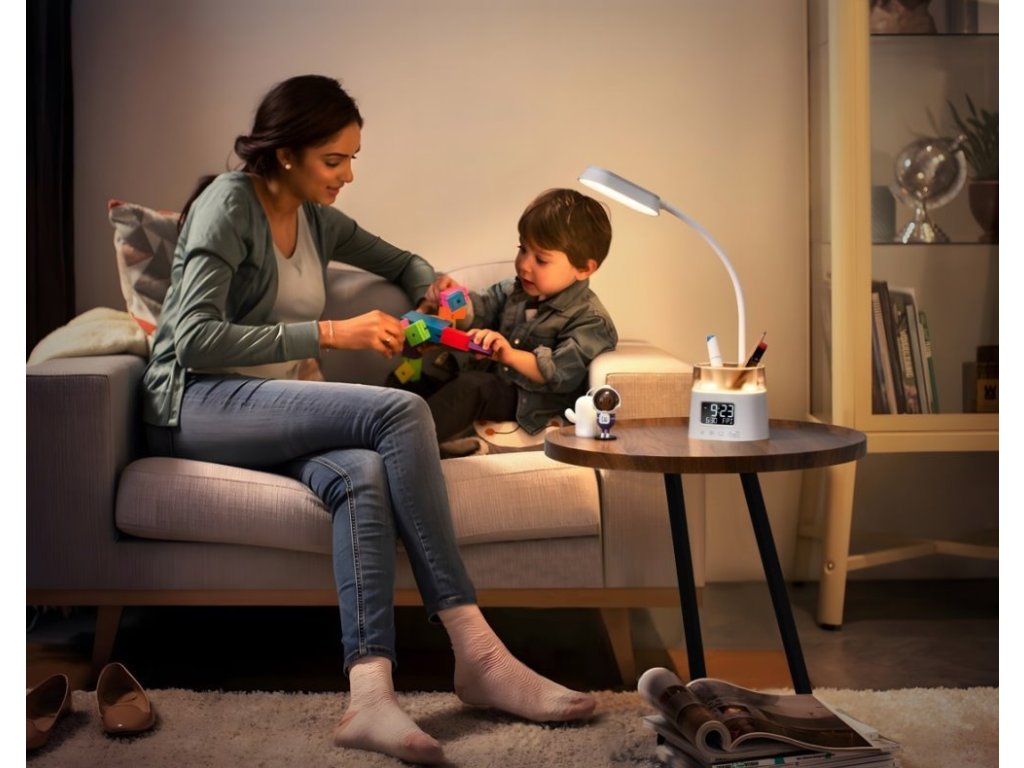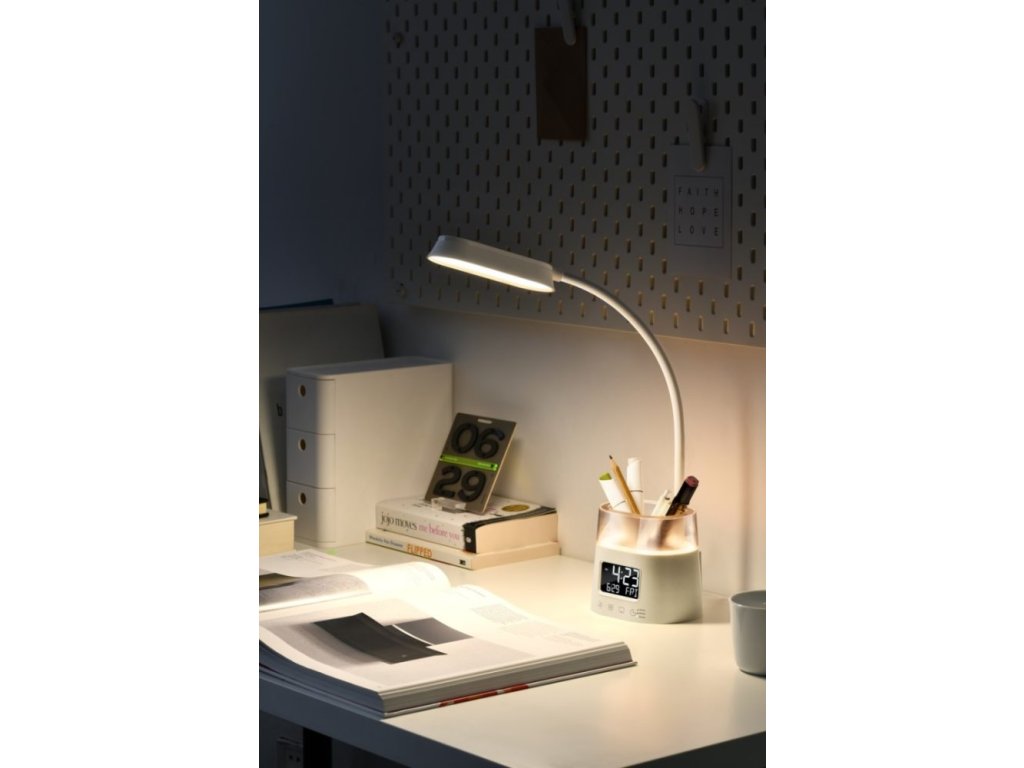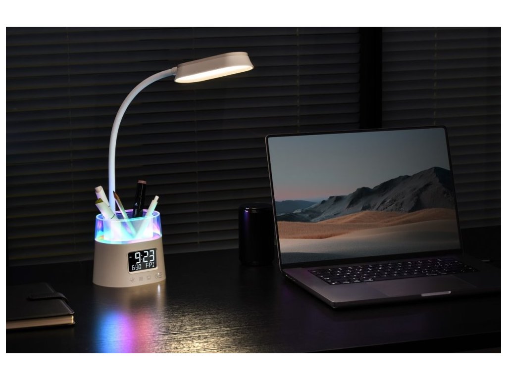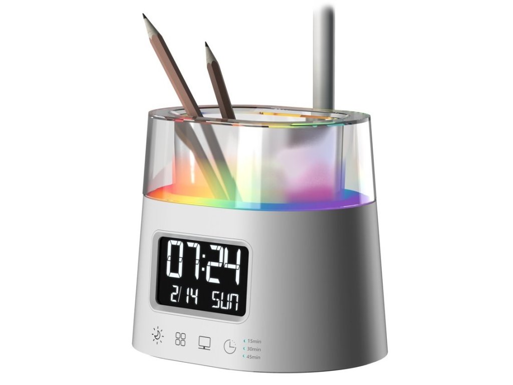 IMMAX LED FRESHMAN RGB 10 WLED stolní lampička s praktickým digitálním displejem a s efektním RGB podsvíceným držákem na tužky nebo dálkové ovladače. Nabízí možnost volit mezi teplým, chladným a přirozeným odstínem světla a třístupňové stmívání světla. LED displej disponuje dvoustupňovým nastavením jasu i možností úplného vypnutí. K dispozici je také volitelné automatické vypnutí svícení po 15/30/45 minutách.