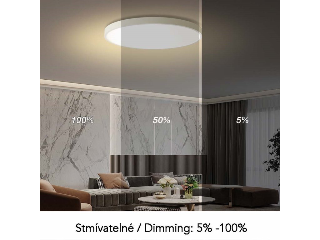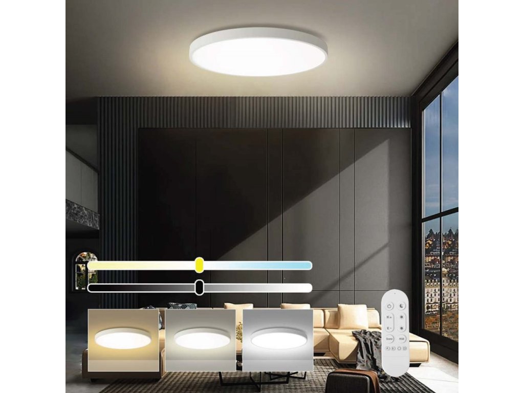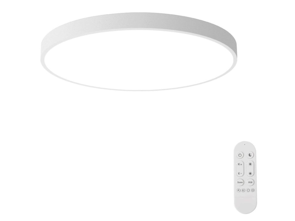 Elegantní chytré stropní LED svítidlo s nastavitelnou teplotou světla a možností ovládání přes Wi-Fi, Bluetooth nebo dálkový ovladač.