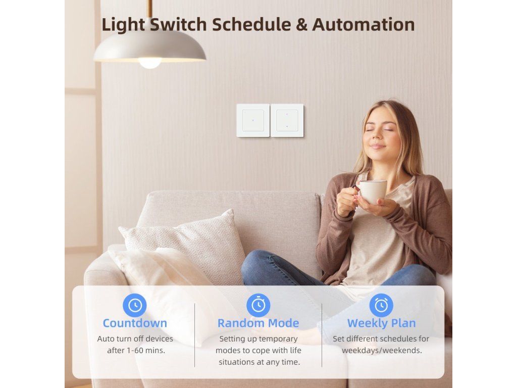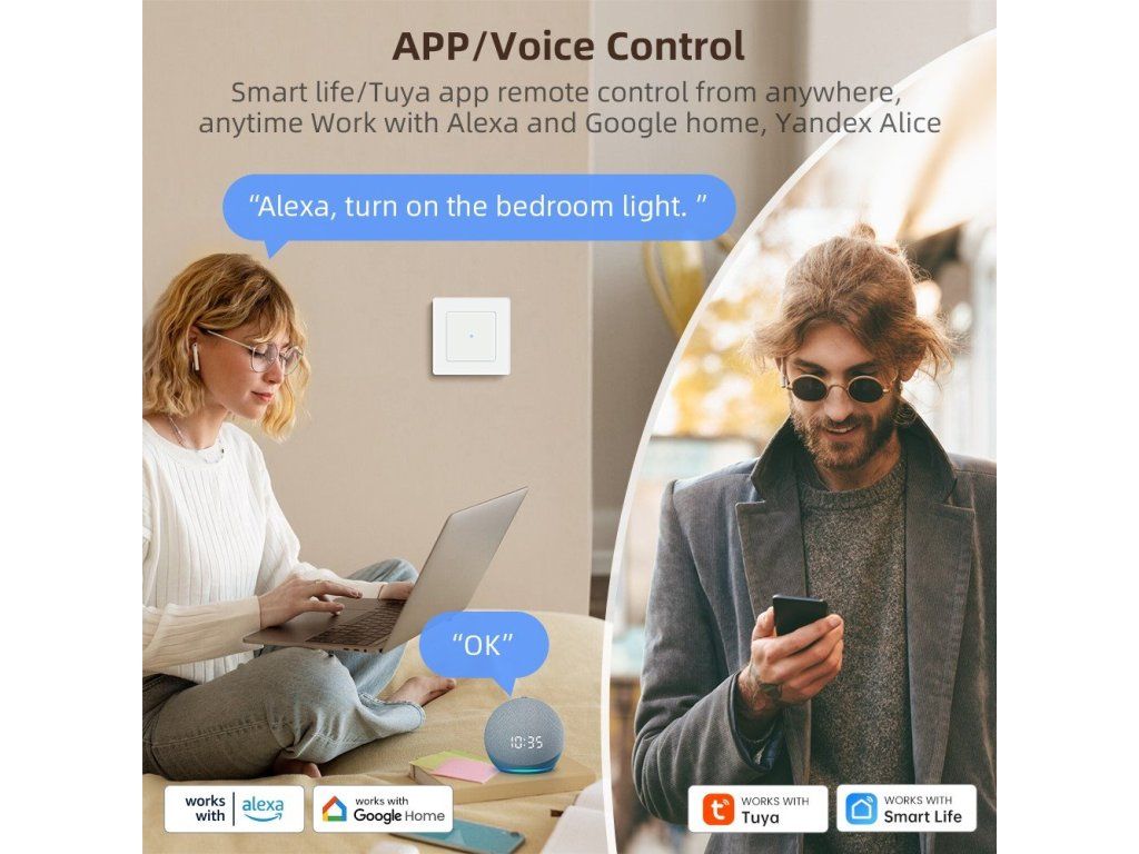 Inteligentní 2-tlačítkový vypínač kombinuje tradiční dotykové ovládání s pokročilými funkcemi chytré domácnosti. Díky Wi-Fi 2,4 GHz připojení a podpoře TUYA systému umožňuje vzdálené ovládání osvětlení prostřednictvím mobilní aplikace i hlasových příkazů.
