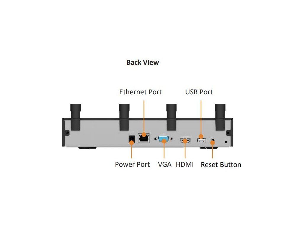 NVR podporuje síťovou šířku pásma 90 Mbps a nabízí přehrávání až 4 kanálů 8 Mpx při 15 fps nebo 4 kanálů 5 Mpx při 30 fps. Pro zálohování jsou k dispozici 2× USB porty a záznamy lze ukládat ve formátu MP4. Zařízení umožňuje živé zobrazení v režimech 1, 4, 8, 9 nebo 10 kanálů současně.