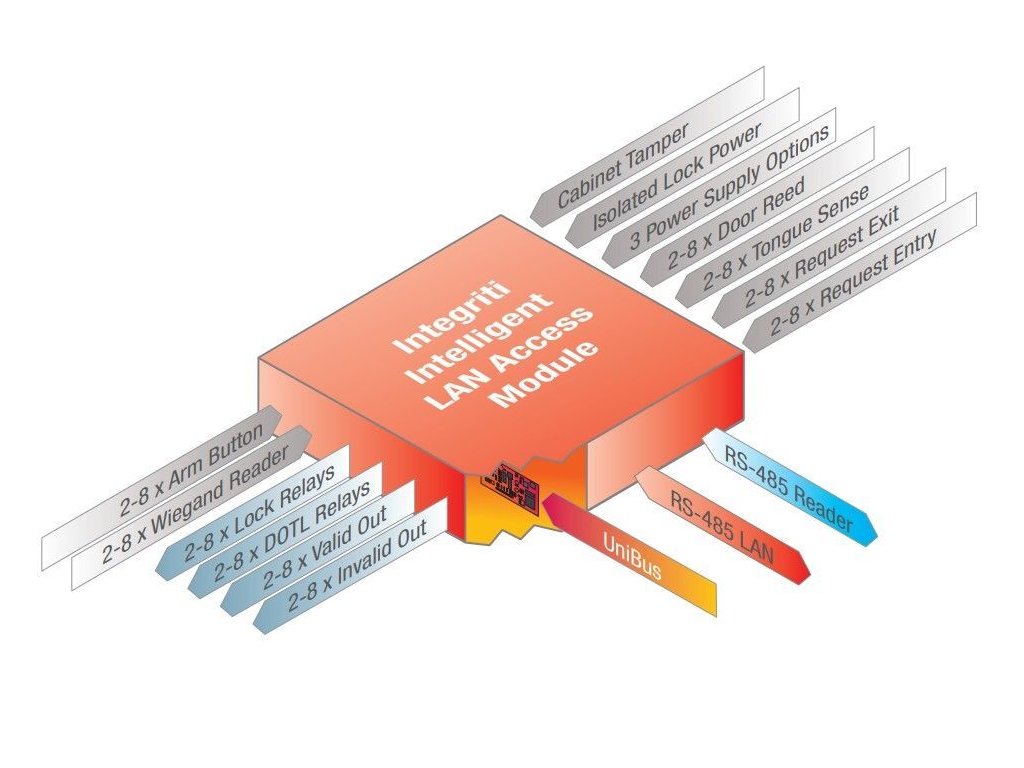 Inteligentní přístupový modul (ILAM) může být použit pro ovládání a monitorování až 8 dveří. Samotný přístupový modul podporuje dvoje dveře, každé s jednou čtečkou, nebo jedny dveře s jednou příchodovou a jednou odchodovou čtečkou. Lze k němu připojit až 3 UniBus rozšiřující moduly pro 2 čtečky pro podporu až 8 dveří, každé ovládané jednou čtečkou, nebo 4 dveří se čtečkami na příchodu a na odchodu.