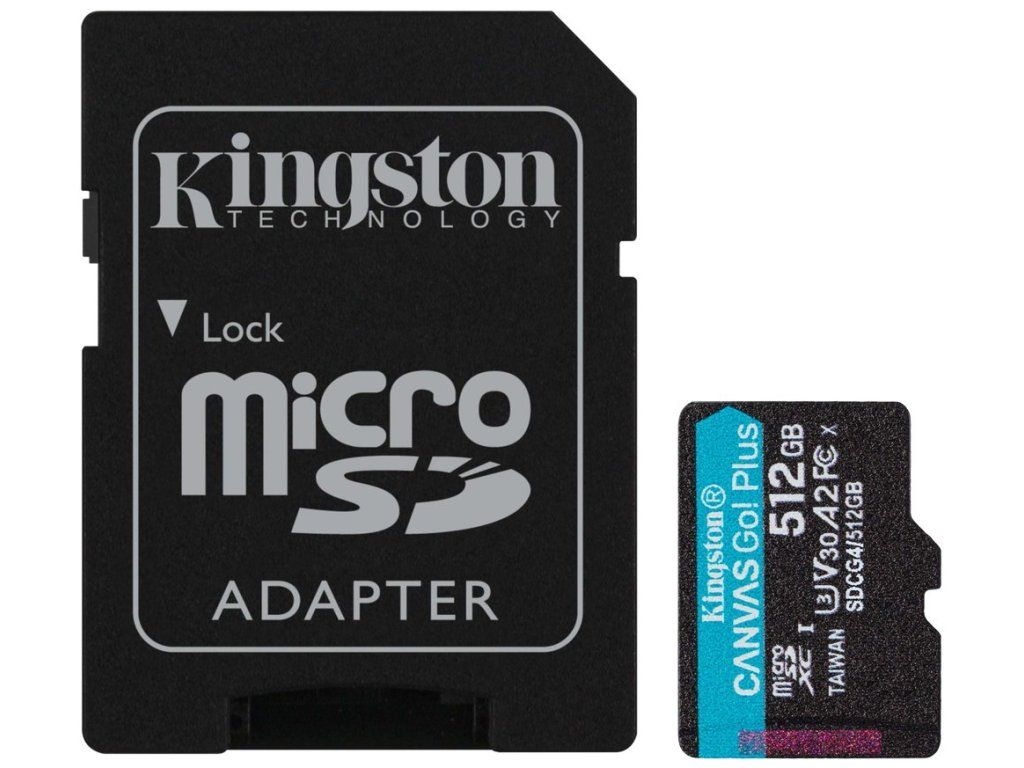 Kingston Canvas Go! Plus Gen4 microSDXC 512 GB + SD adaptérPaměťová karta formátu microSDXC nabízí kapacitu 512 GB, rychlost čtení až 200 MB/s a rychlost zápisu až 160 MB/s. Třídy U3 a V30 umožňují plynulé nahrávání videí v rozlišení 4K UHD, zatímco třída A2 se postará o rychlejší načítání aplikací a bezproblémové hraní na chytrých telefonech a tabletech. Součástí balení je SD adaptér.