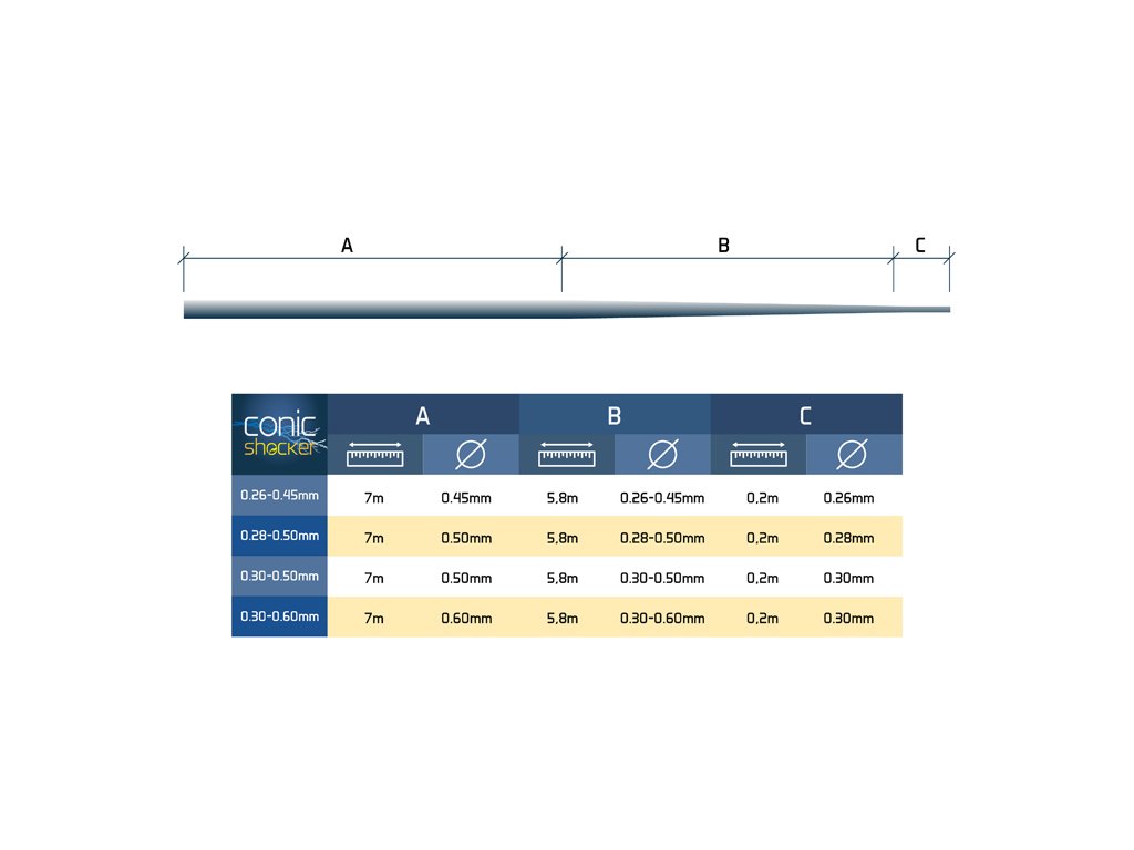Delphin Conic SHOCKER je kónický šokový vlasec, díky kterému nahazování na velké vzdálenosti nabývá nového rozměru! Podstata kónicky zúženého vlasce spočívá v postupně se měnícím průměru, díky čemuž je možné spojit jej s kmenovým vlascem pomocí velmi malého uzlíku. Právě to je jedním z klíčových parametrů pro mnohem snazší odvíjení vlasce z cívky a pro hladký průchod očky. Na opačném konci je však dostatečně tlustý a pevný, aby bez problémů odolal překážkám pod vodní hladinou či výpadům velkých ryb. Zároveň se do prutu můžete opřít plnou parou, bez obav o odtržení koncové sestavy při krátkodobém přetížení během nahazování. Kombinace zmíněných faktorů zaručuje, že při nahazování budete schopni dopravit své montáže podstatně dále než při použití klasické „šokovky“ se stejným průměrem po celé délce. V balení na cívce se nachází navinutých 6 kusů návazců o délce 13 metrů, které jsou vždy označeny nálepkou. mm/lbs: 0.26mm-0.45mm – 10 lbs – 26 lbs 0.28mm-0.50mm – 12 lbs – 32 lbs 0.30mm-0.50mm – 14 lbs – 32 lbs 0.30mm-0.60mm – 14 lbs – 44 lbsDoplňkové parametry