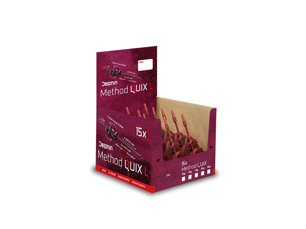 Špičkové method feederové krmítko, navržené vývojovým týmem značky Delphin. Už na první pohled se vyznačuje specifickým tvarem žeber, díky kterému krmivo během nahazování výborné drží na krmítku a po dopadu na dno se snáze uvolňuje. Velkou výhodou krmítka QUIX je možnost snadné výměny olověné části spolu s tělem. Umožňuje to vyjímatelná trubička a drážka na olověné části. Po vysunutí trubičky z těla krmítka jej stačí složit z vlasce a použít jiné s rozdílnou hmotností. Taková variabilita vám poskytne možnost přizpůsobení se různým podmínkám během lovu, bez nutnosti zdlouhavého převazování koncové sestavy. Tvar olověné zátěže spolu s výstupky zajišťuje nejen výborné rozložení hmotnosti, ale také perfektní stabilizaci na dně v lovném místě. Díky aerodynamickému tvaru a prodloužené trubičce je s krmítkem možné dosahovat velké vzdálenosti během nahazování. Punc originality dodává produktu typická bordó barva a černé závaží s červenými skvrnami. V základu je krmítko dodáváno s rychlovýměnným obratlíkem s pojistkou a gumičkou proti zamotání. Technické parametry: krmítko 55x30x25mm délka trubičky 85mm ROTECTED DESIGN - Tento produkt byl kompletně navržen designéry značky Delphin. Jeho design a technické řešení jsou natolik unikátní, že je registrován a chráněn na území celé Evropské unie.Doplňkové parametry
