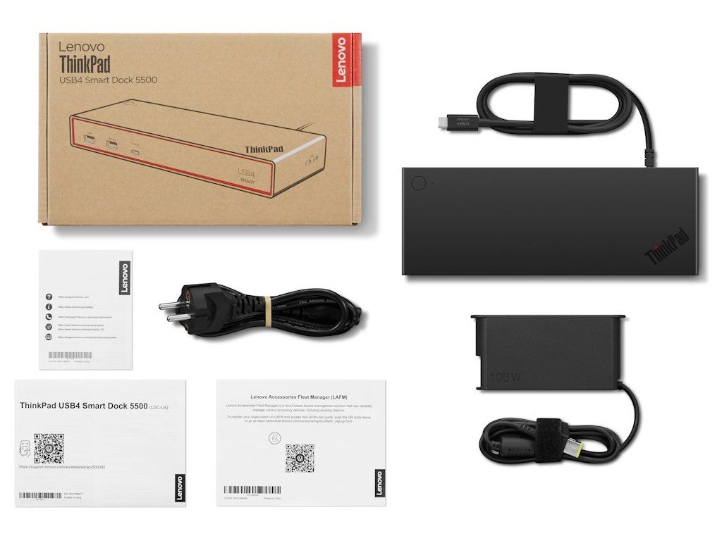 ThinkPad USB4 Smart Dock s integrovaným 1m USB4 kabelem, napájecí adaptér 100 W, napájecí kabel, Lenovo Accessories Fleet Manager leták, setup poster, dokumentace