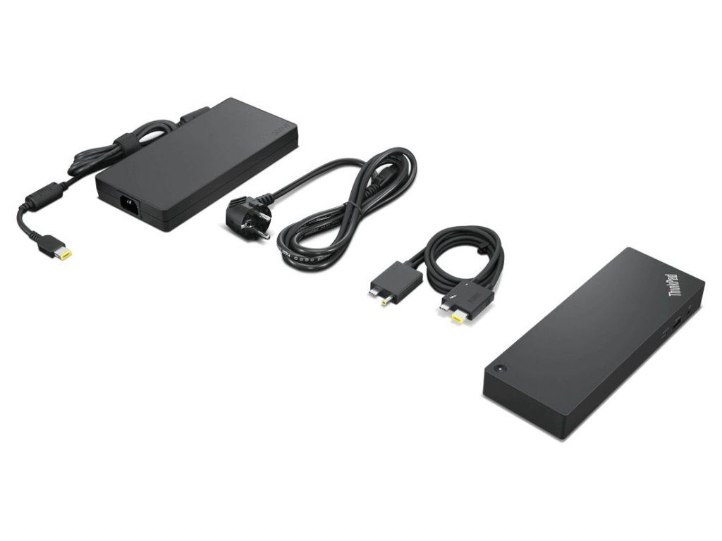 Součástí balení je napájecí adaptér s výkonem 300 W, napájecí kabel a kabel s napájecím a Thunderbolt 4 konektorem pro připojení dokovací stanice k notebooku.