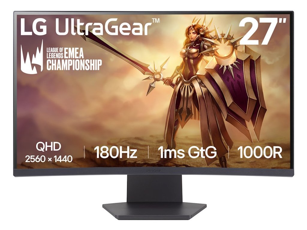 LG UltraGear 27GS60QC-BProhnutý LED monitor s úhlopříčkou 27" a QHD rozlišením 2560 × 1440 obrazových bodů nabízí jas 300 cd/m2 a dobu odezvy 1 ms. Obnovovací frekvence až 180 Hz spolu s technologií AMD FreeSync nabízí intenzivní akci bez trhání, zadrhávání nebo rozmazávání obrazu při pohybu. Použitím technologie VA je dosaženo širokých pozorovacích úhlů 178° horizontálně i vertikálně. Mezi hlavní přednosti patří podpora HDR 10 a pokrytí 99 % sRGB barevné palety.